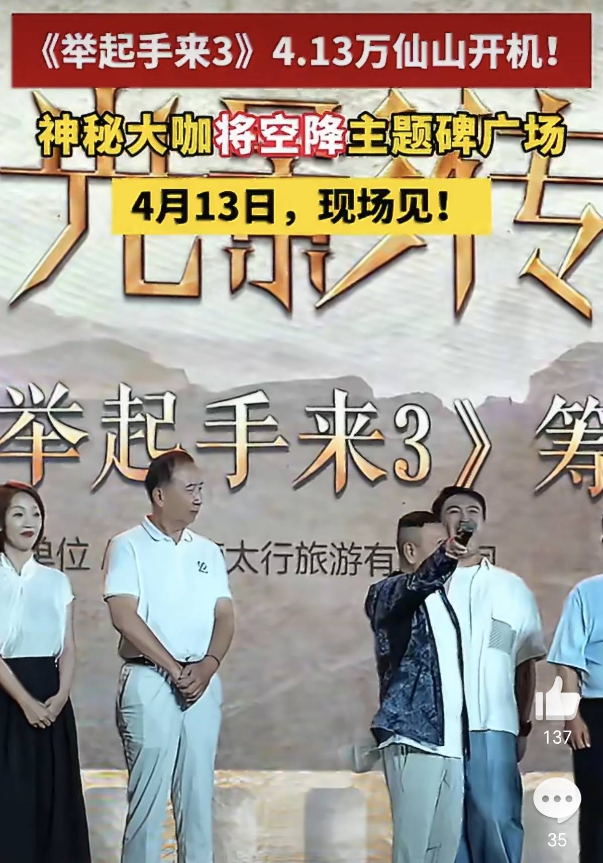 4月13日,潘长江在社交平台激动地发出一段视频:“非常激动的心情告诉大家,今天《举起手来3》正式开机了!”