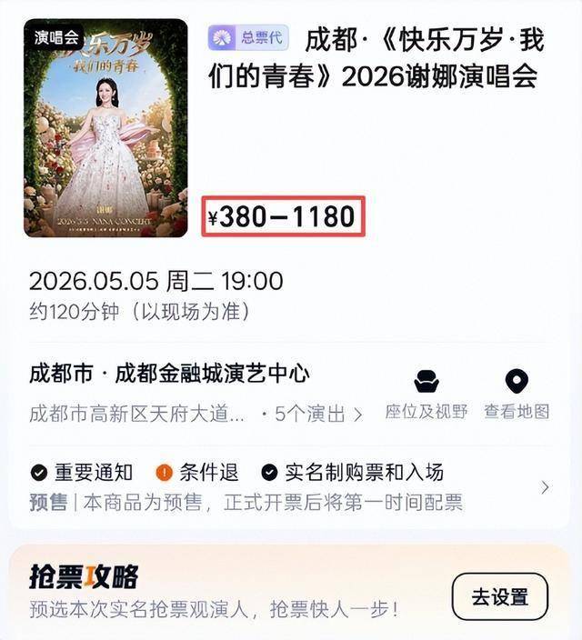 谢娜这次演唱会,票价分4档:最低380元,中间档580元、880元,最高档直接干到1180元。