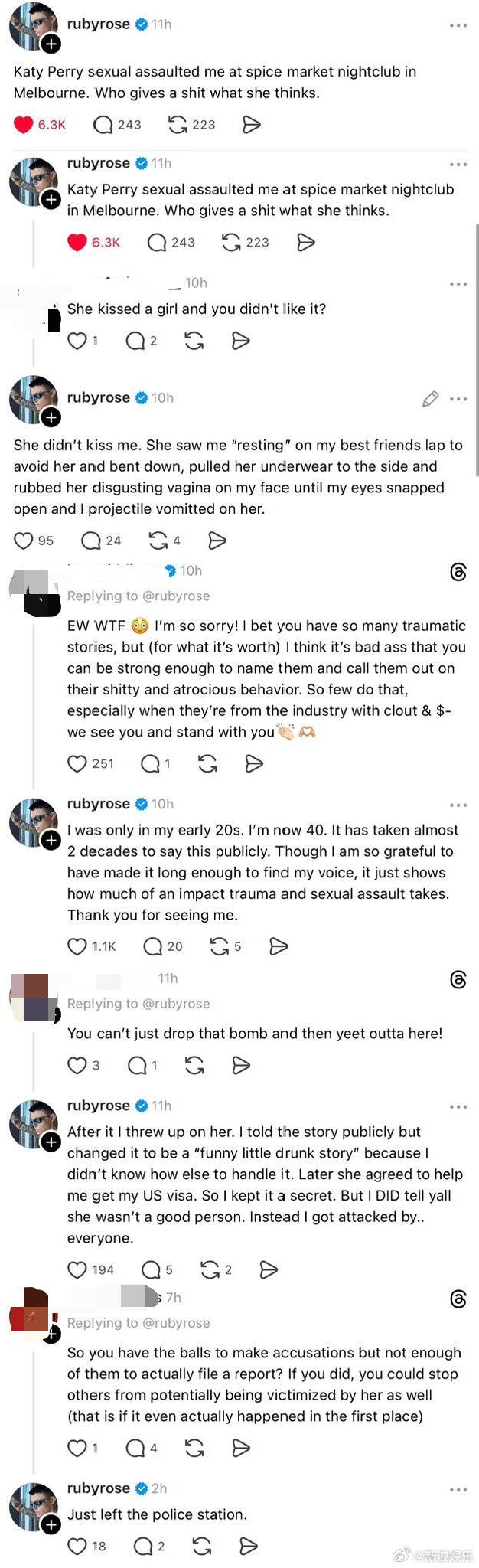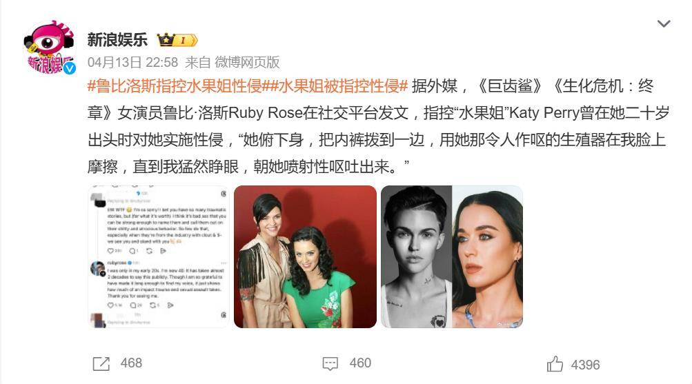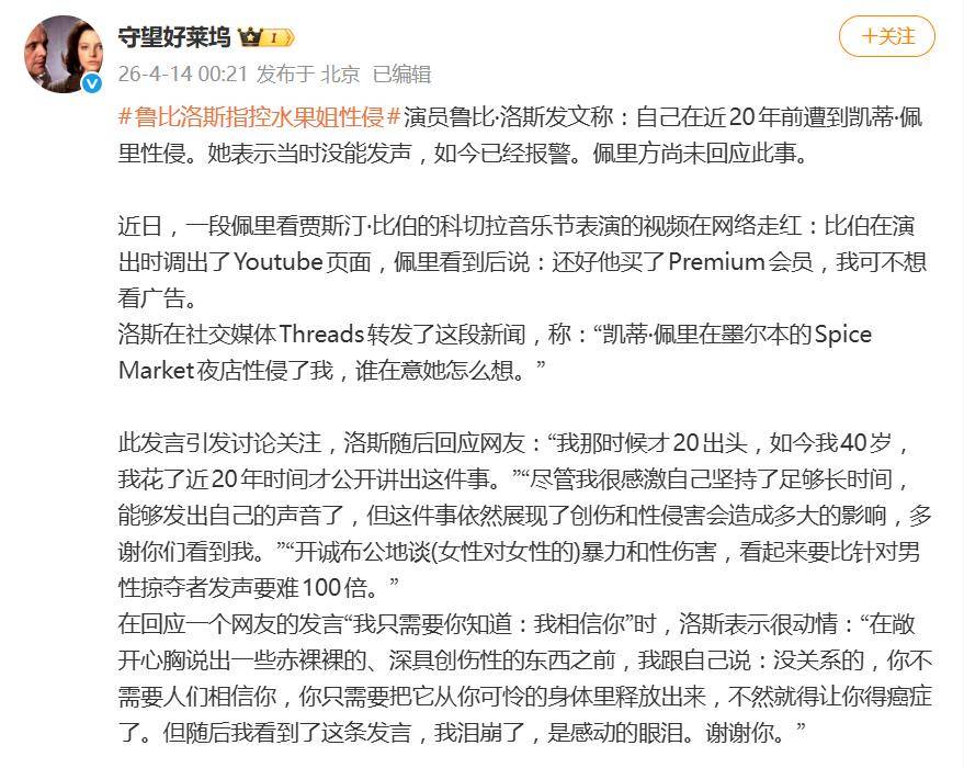 据4月13日晚间报道,娱乐圈被一桩近二十年前的旧案炸开了锅。曾出演《巨齿鲨》《生化危机:终章》的女演员鲁比·洛斯在社交平台公开发文,指控国际流行巨星“水果姐”凯蒂·佩里在她二十岁出头时对她实施性侵,并称自己已经报警。