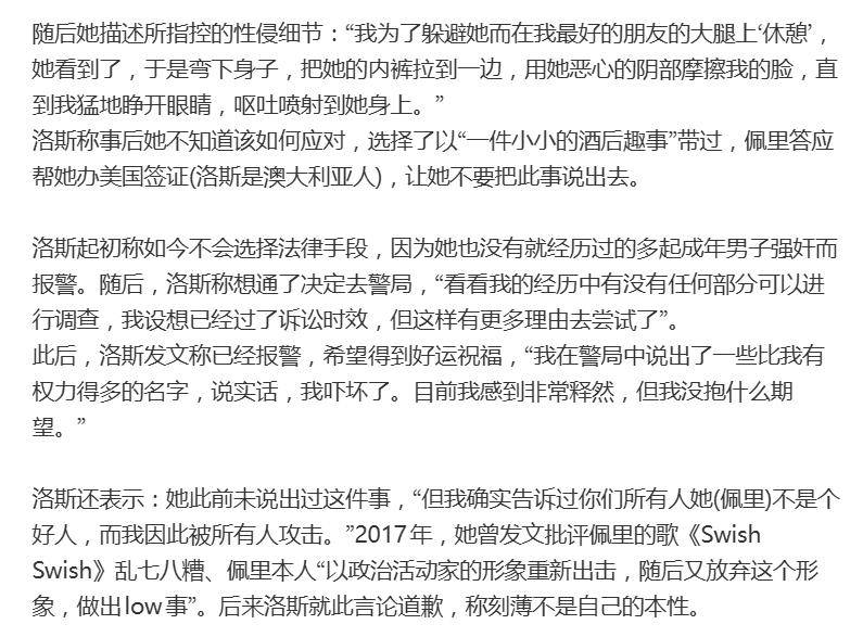 在回应网友的支持时,洛斯情绪激动。她透露,在决定说出真相前,她告诉自己“不需要人们相信”,只是为了将这段创伤从身体里释放出来,以免积郁成疾。而网友一句简单的“我相信你”,让她瞬间“泪崩”。据洛斯叙述,事发后她不知如何应对,只能将其轻描淡写为“一件小小的酒后趣事”。她还提到,当时佩里曾以帮她办理美国签证(洛斯是澳大利亚人)为条件,要求她不要将此事说出去。