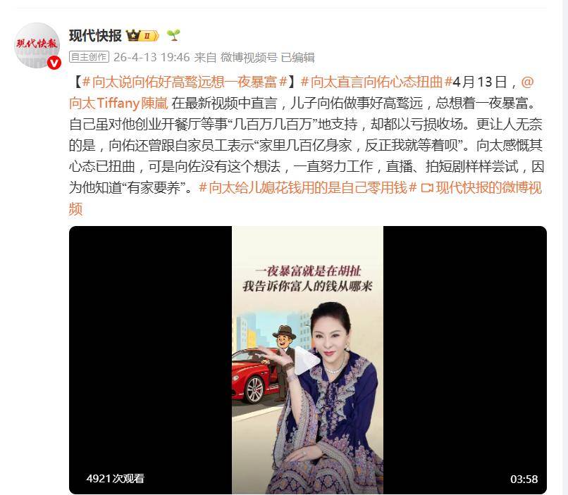 向太在视频中透露,自己曾对向佑的创业想法给予支持,无论是开餐厅还是其他项目,都是“几百万几百万”地投入,但最终结果却都以亏损收场。更让她感到无奈的是,向佑甚至曾对自家员工表示:“家里几百亿身家,反正我就等着呗。”这句话让向太深感其心态已然出现问题,认为儿子将财富视为可以坐享其成的等待物,缺乏基本的奋斗意识。