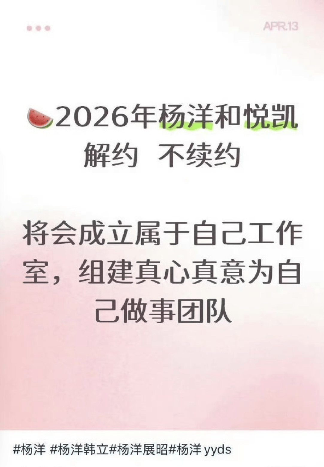 这不,杨洋和悦凯不续约的消息来了。看图片应该是谣言培养皿的小某书,没有任何其他证据,就是说2026年杨洋和悦凯解约,不续约,杨洋将会成立属于自己的工作室,组建真心真意为自己做事团队。