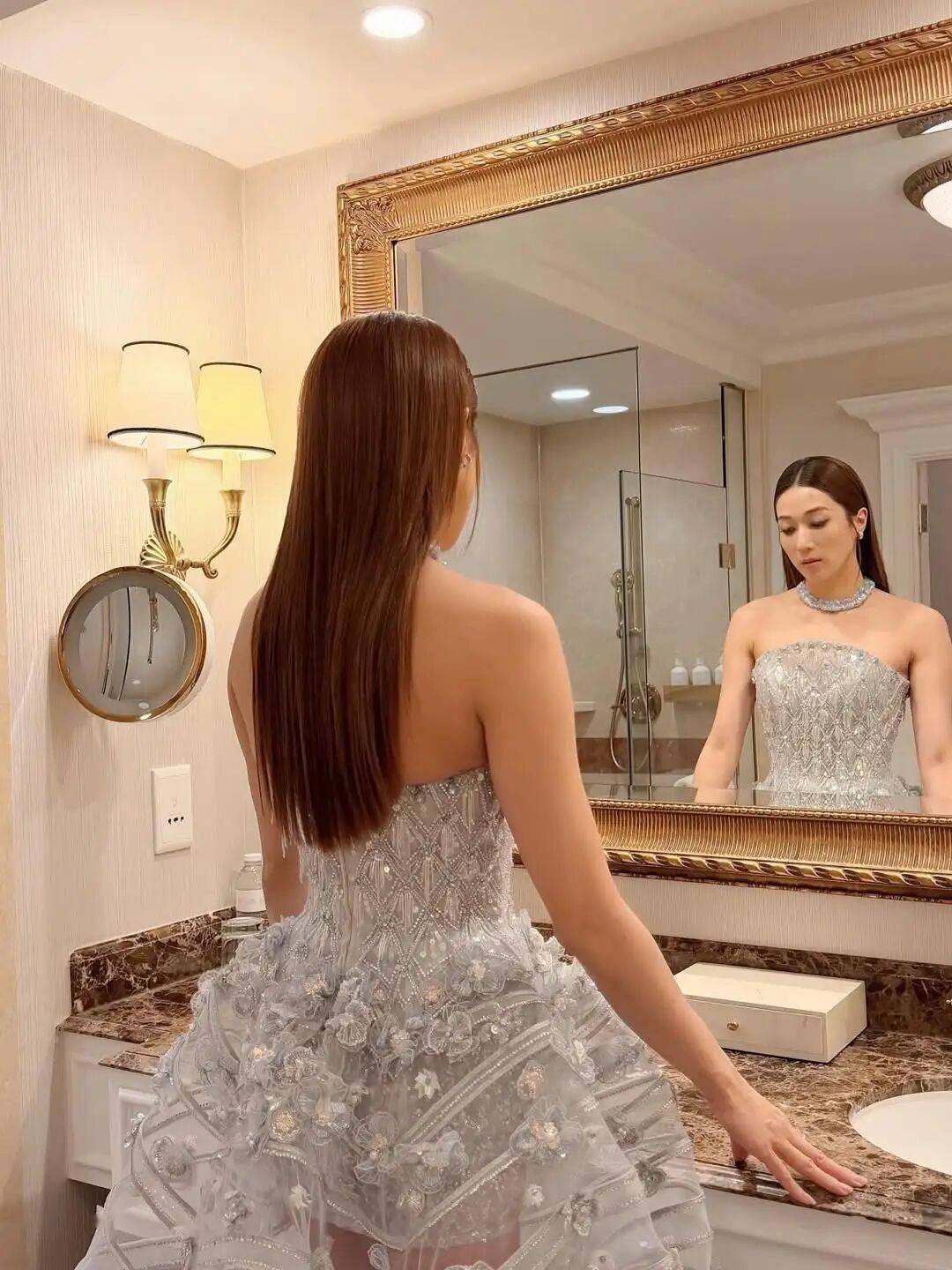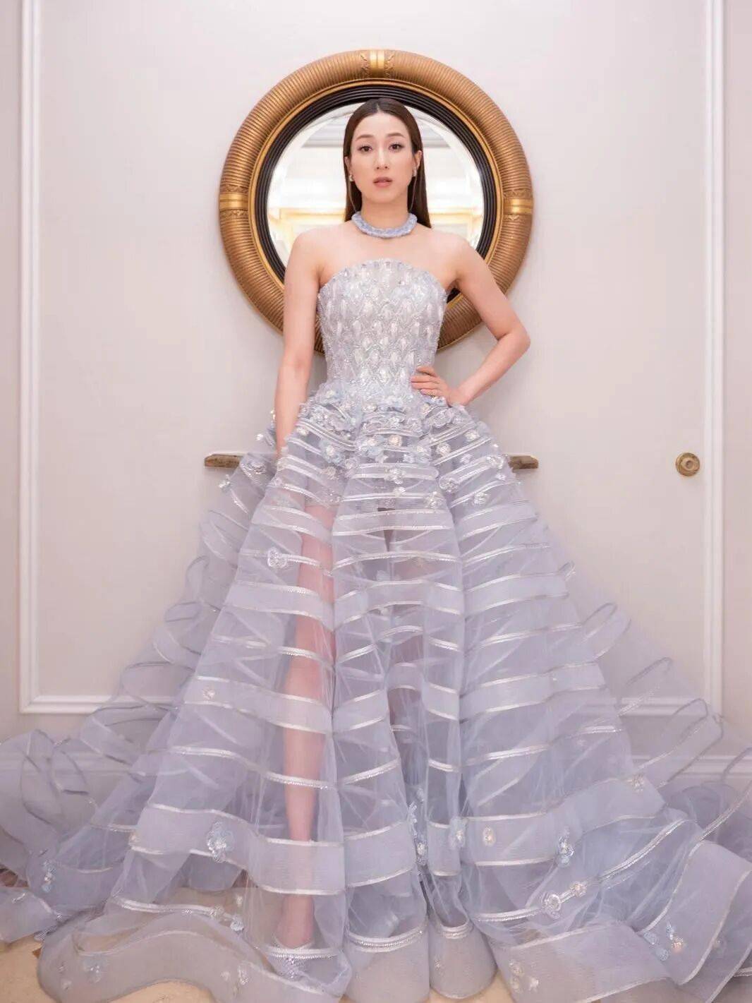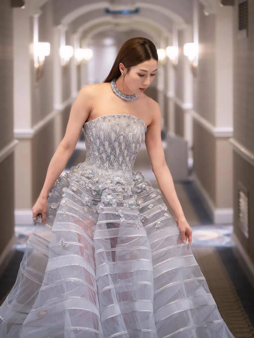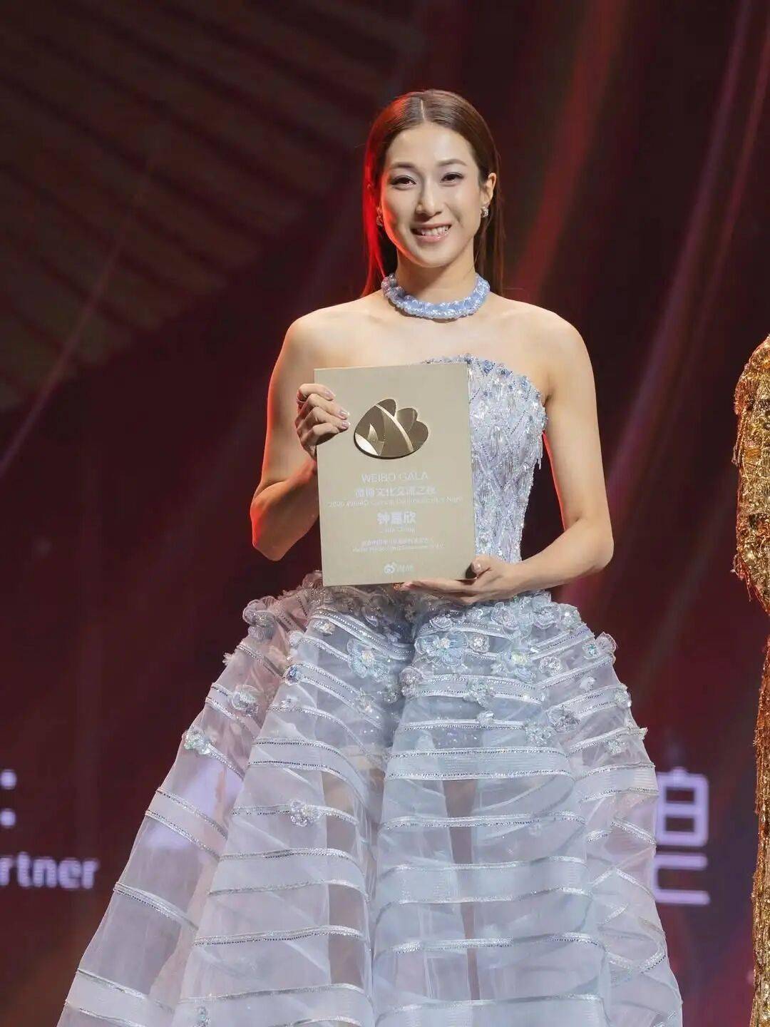 钟嘉欣夺得“年度跨界呈现艺人”,她身穿蓝色透视晚装,优雅十足!