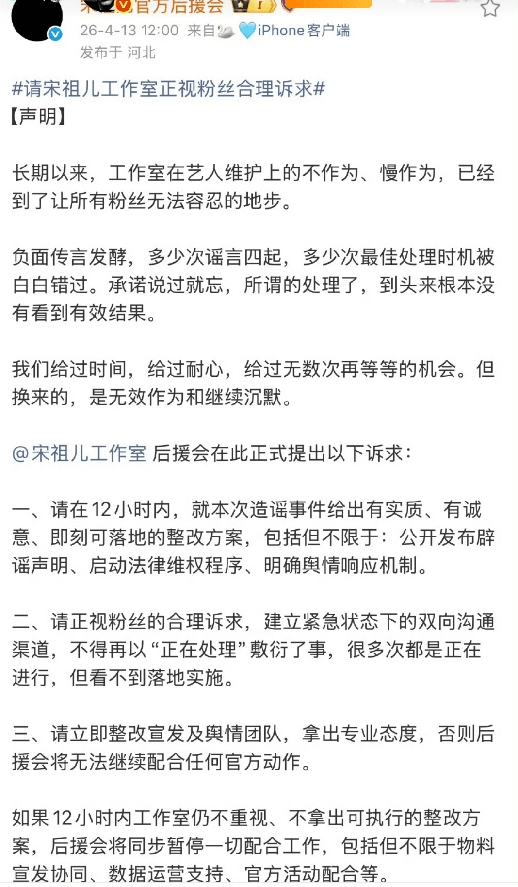 说到饭圈整治,这可是今年内娱的重头戏。从取消明星榜单到严禁集资应援,饭圈的“生存环境”越来越严苛。宋祖儿后援会这个时候暂停运营,说不定是在“避风头”。毕竟以前后援会的各种操作,比如集资买杂志、包场应援啥的,现在都属于“高危行为”。网友们调侃:“后援会这是提前‘躺平’了,免得被查水表。”