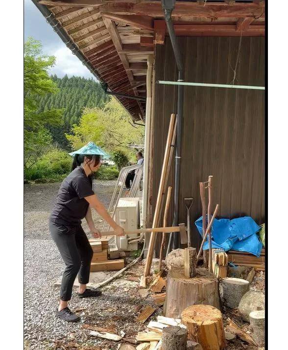 他们在福冈的住所隐匿在山林间,距离最近车站步行一小时。 院子里有小菜园,角落养着鸡鸭。 蒙嘉慧被拍到在木屋前劈柴,穿宽松衣物,脚踩黑色解放鞋,头戴斗笠,劈出的木柴方正整齐。 郑伊健偶尔帮妻子的公司发传单,在二手书店淘漫画。