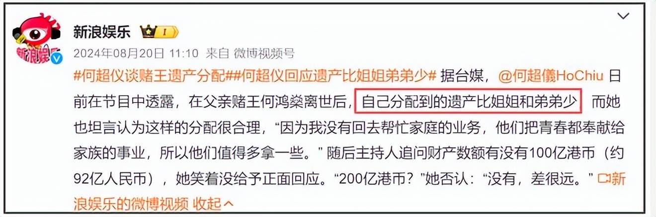 赌王去世后,妹妹何超仪在接受采访时,曾被问到分到了多少遗产。她坦言自己分到的,比姐姐弟弟们要少,被问及是否有 100 亿时,她也没有否认。