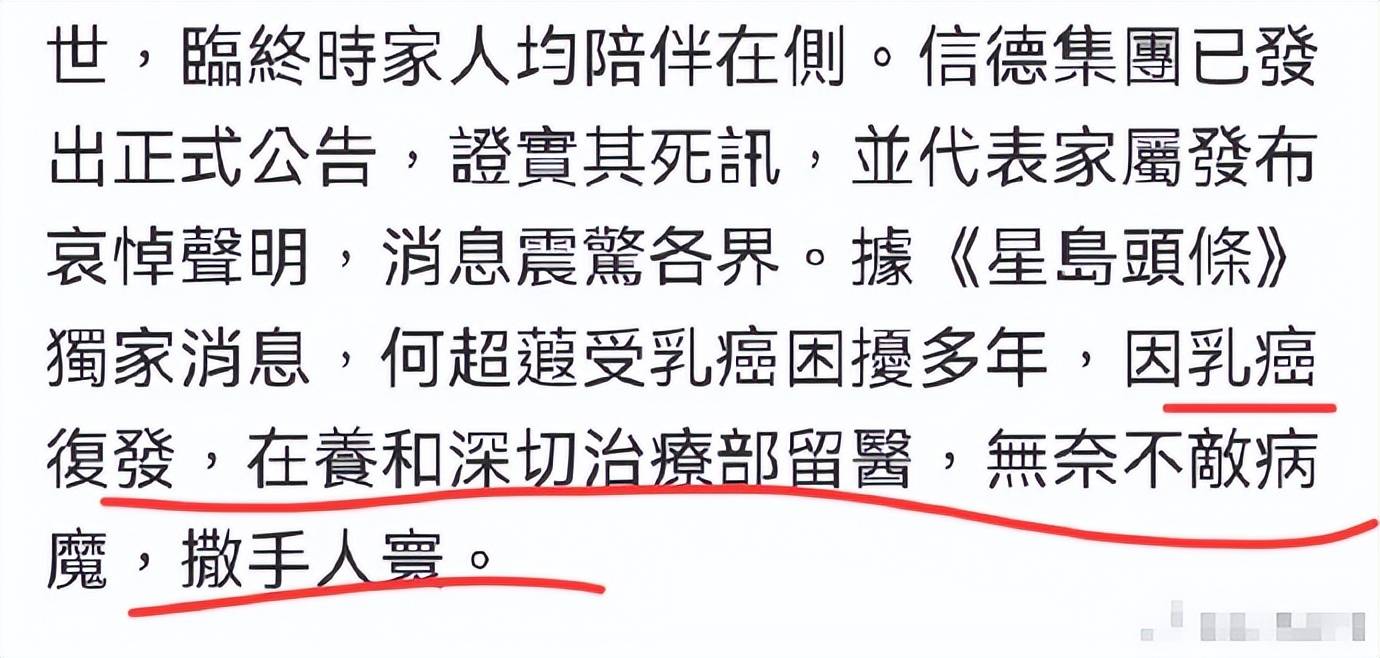 据港媒报道,何超蕸离世的原因,是乳腺癌复发,在医院接受了一段时间的治疗后,终究还是没能等到奇迹,撒手人寰。