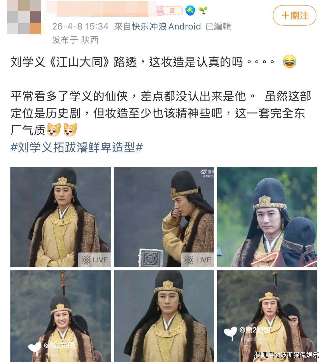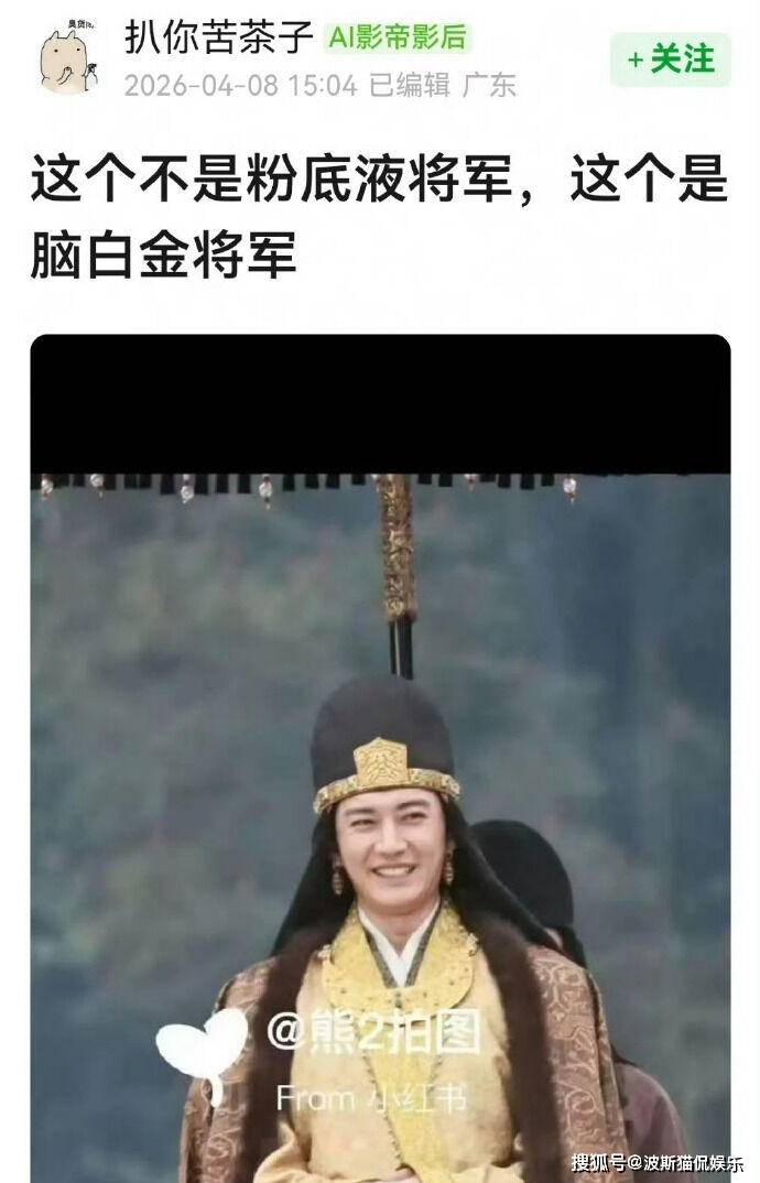 刘学义的“帝王”造型同样没逃过网友毒舌。他穿着金黄色锦服、深色毛皮斗篷,头上戴着黑色圆顶高帽,帽子上还有金色龙纹圆牌。有人看到后直接联想到大陆药品广告“脑白金”里的老爷爷,还有网友开玩笑,“这个不是粉底液将军,是脑白金将军”,觉得造型太像“老年限定”。顺着讨论,网友纷纷表示“离开粉底液显原形”,“惨不忍睹,一点想看的想法也没有”。但也有不少人认为这样的造型就是还原历史,非常合适。