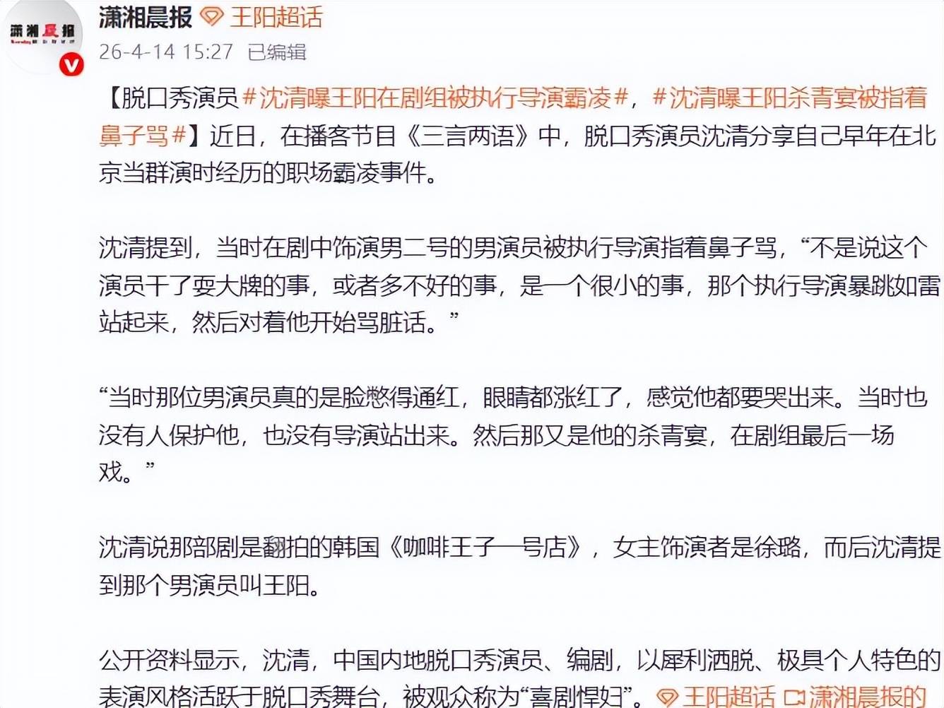 据沈清描述,那本应是庆祝剧组完成最后一场戏的杀青宴,却成了王阳职业生涯中一个冰冷的注脚。执行导演因一件小事“暴跳如雷”,站起来对着王阳破口大骂。沈清特别强调:“不是说这个演员干了耍大牌的事,或者多不好的事,是一个很小的事。”