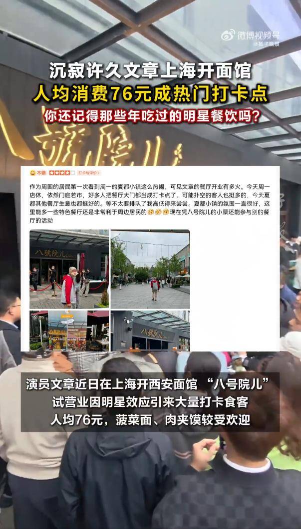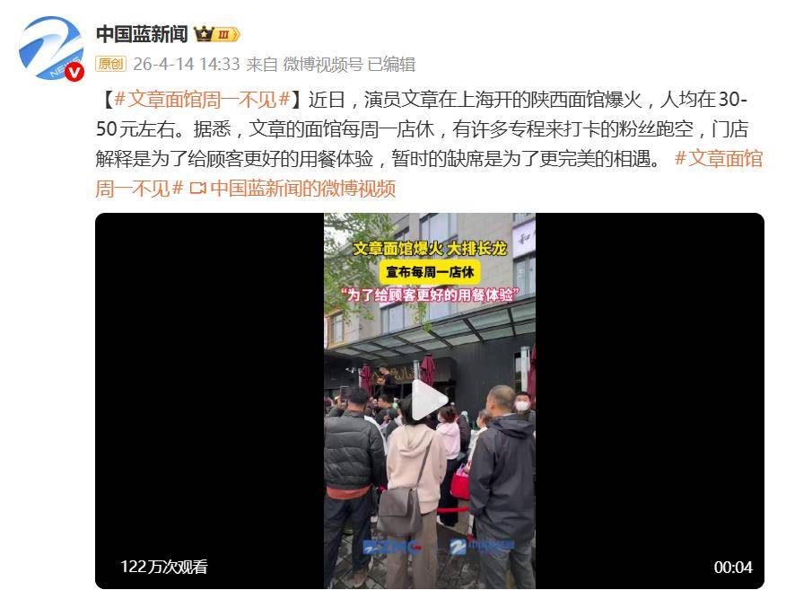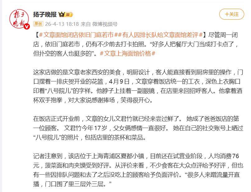 据4月14日报道,最近,演员文章在上海开的陕西面馆,以一种意想不到的方式火了。不是因为某道招牌菜,而是因为它的“店休日”——“文章面馆周一不见”直接冲上热搜,成了粉丝和食客们的新谈资。