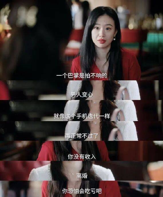 她还将出轨合理化:“男人变心就像手机迭代”“一个巴掌拍不响”,被观众形容为“三观炸裂但句句扎心”。