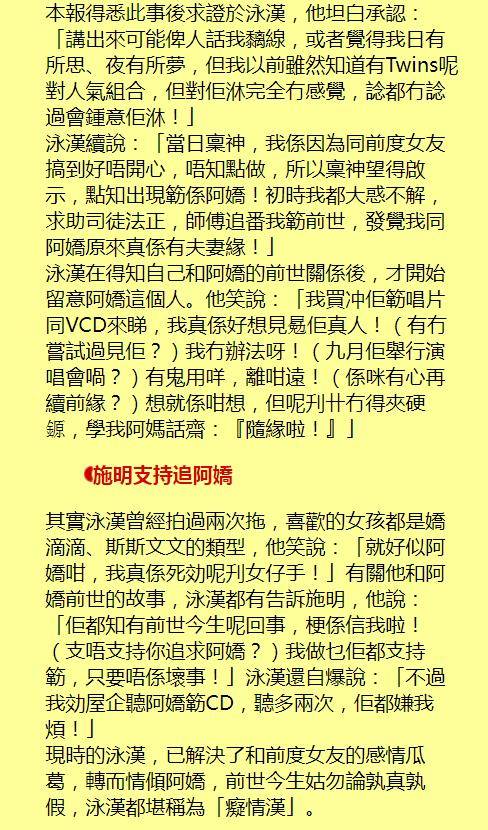 施明最无法释怀的,是儿子回港进入演艺圈后,疑似遭到媒体陷害。据悉当年李泳汉称钟欣潼(阿娇)是自己前世妻子,还被拍到拿着玫瑰花在阿娇住所楼下等候,被塑造成痴情男甚至遭到嘲讽。