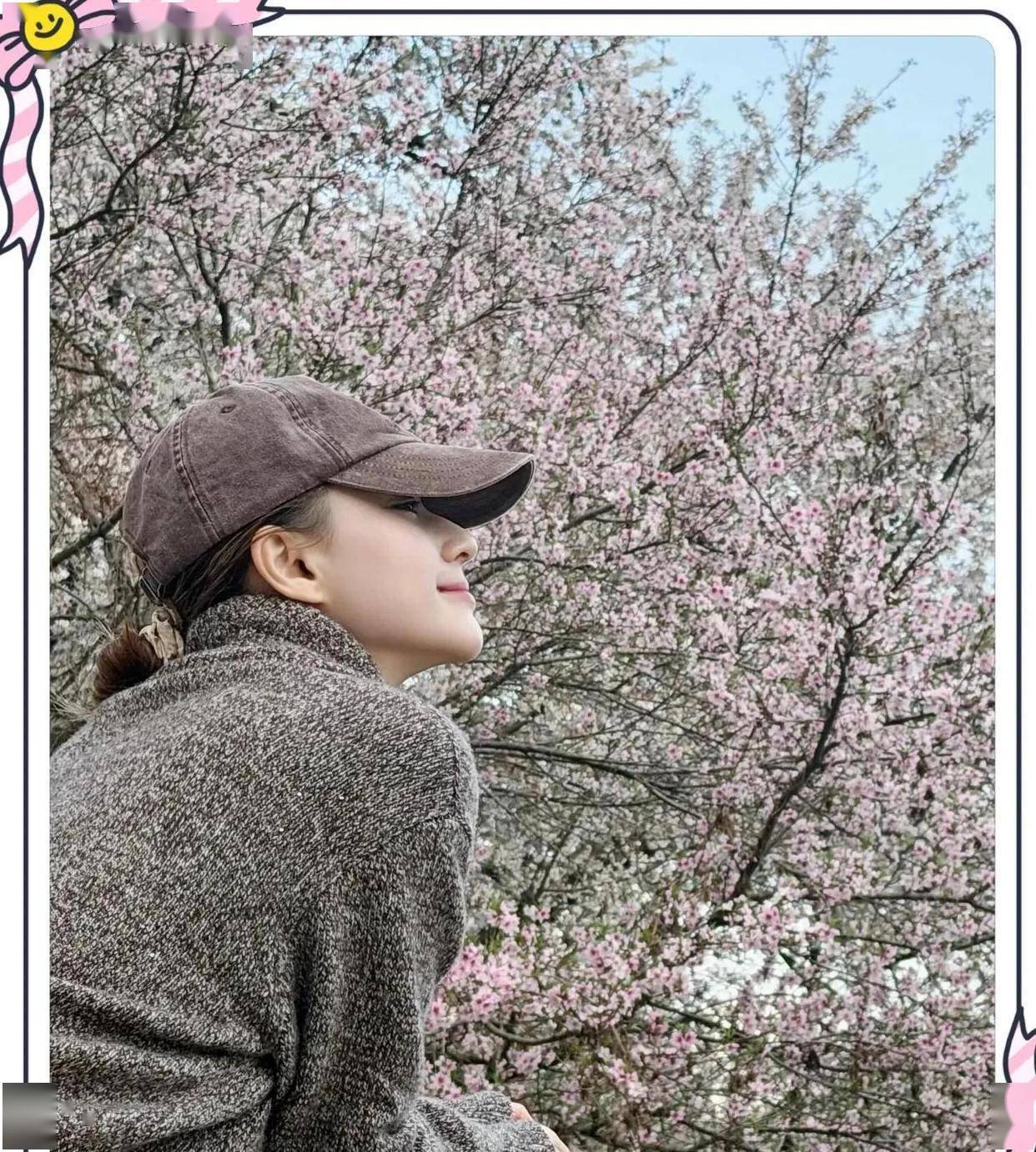 另一张侧颜照里,她凝视着粉色樱花,嘴角含笑。