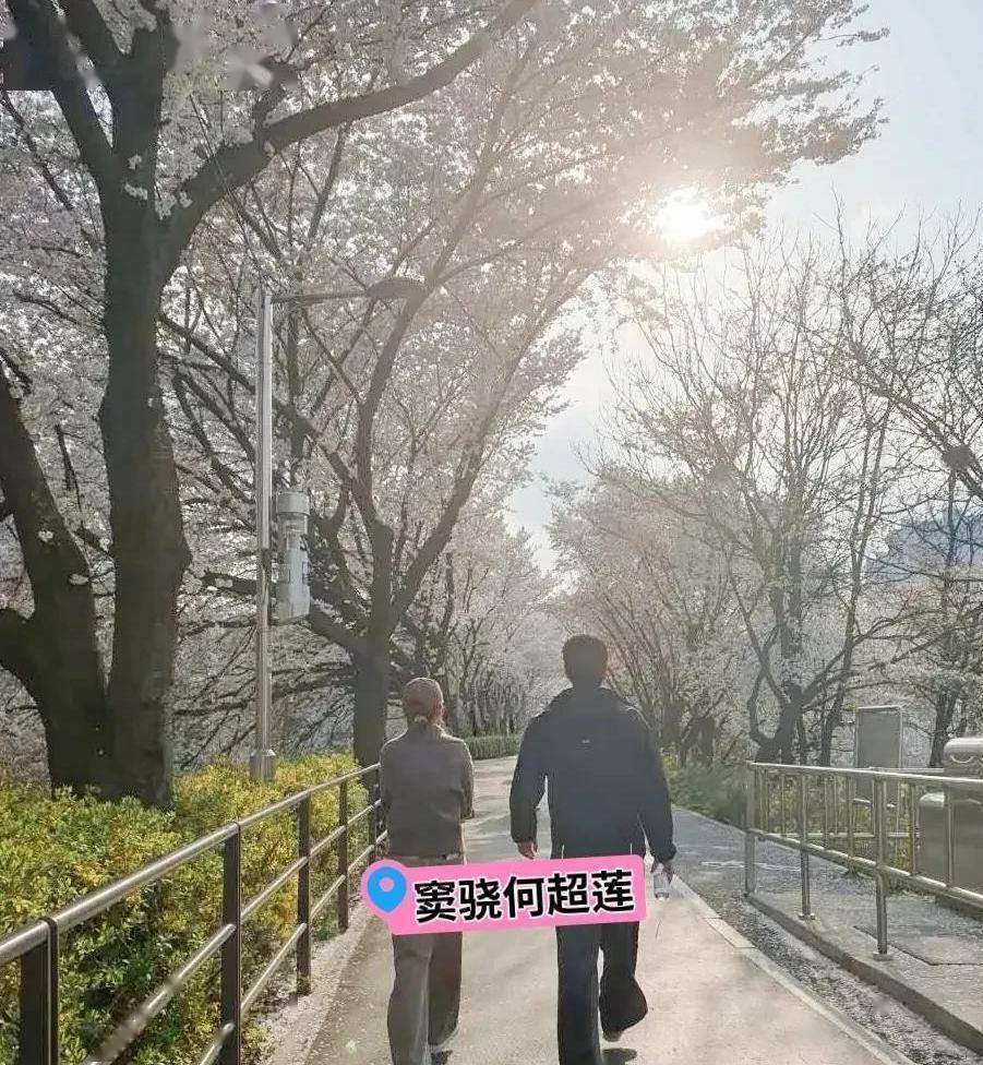 照片里最触动网友的是一张背影照。 暖阳透过樱花树洒下来,夫妻二人并肩走在樱花小径上,步伐整齐。 没有面对镜头,反而透出一种老夫老妻的默契。