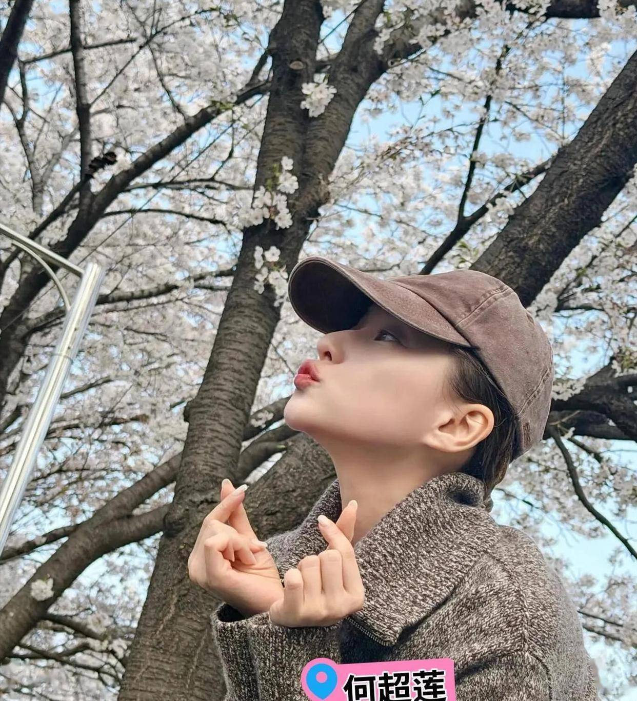 何超莲还晒了几张由窦骁掌镜的“老公视角”大片。她头戴咖色鸭舌帽,穿着同色系针织衫,在白色樱花树下嘟嘴卖萌,对着镜头比出“手指爱心”。