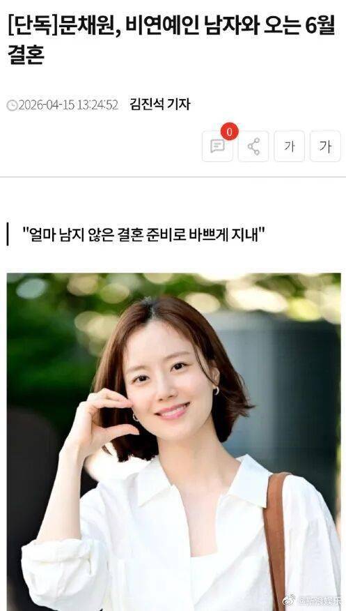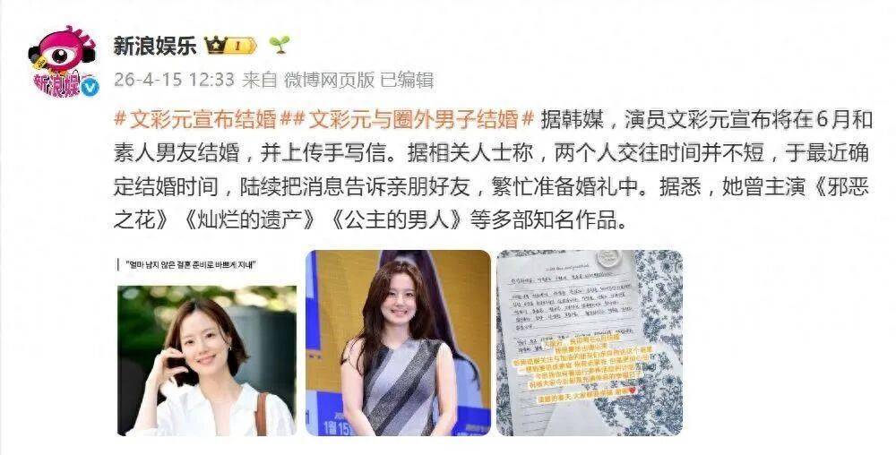 韩国演艺圈今日迎来一桩重磅喜讯!知名演员文彩元于4月15日正式宣布,她将于今年6月与交往多年的圈外男友步入婚姻殿堂。一纸亲笔手写信,瞬间点燃了全网祝福。据韩媒MyDaily报道