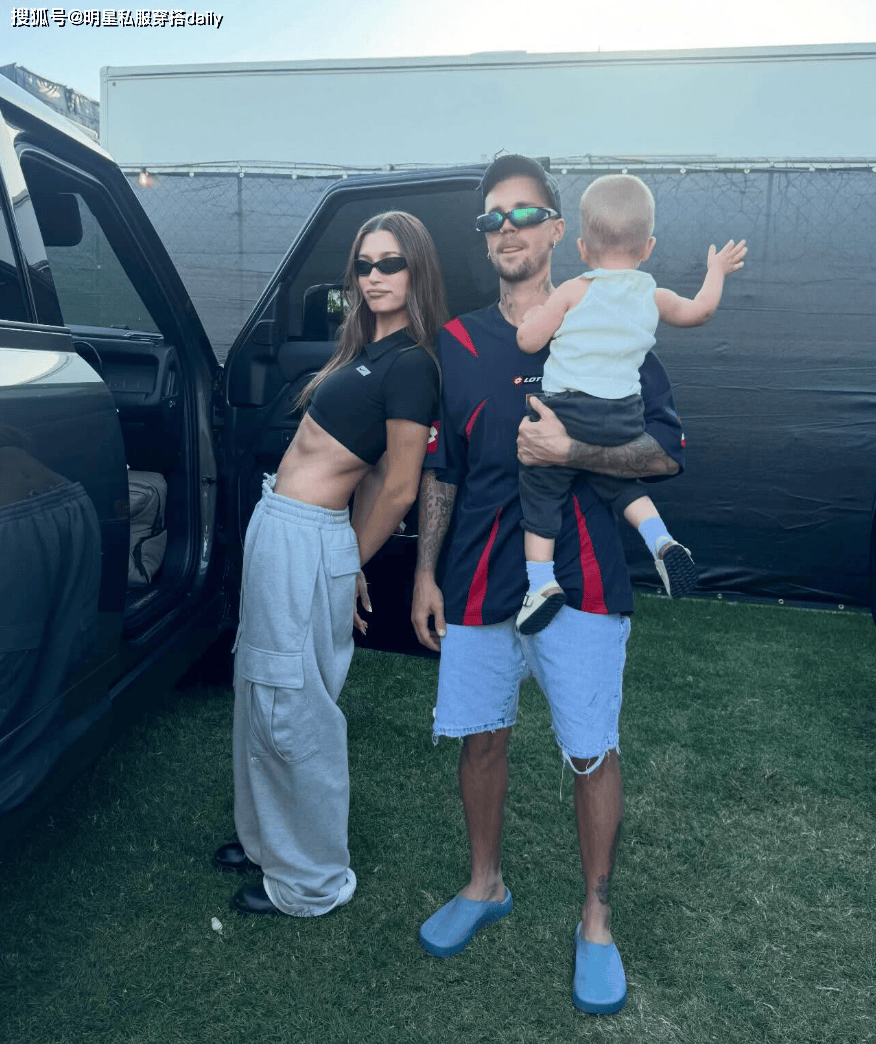 贾斯汀比伯穿了一款红蓝撞色运动风T恤,搭配了一条蓝色毛边牛仔短裤,脚踩蓝色拖鞋,打扮休闲!而作为时髦精的海莉,则身穿一件藏蓝色短款上衣,秀出腹肌,搭配灰色工装抽绳裤,单手抱娃,力量感拉满!