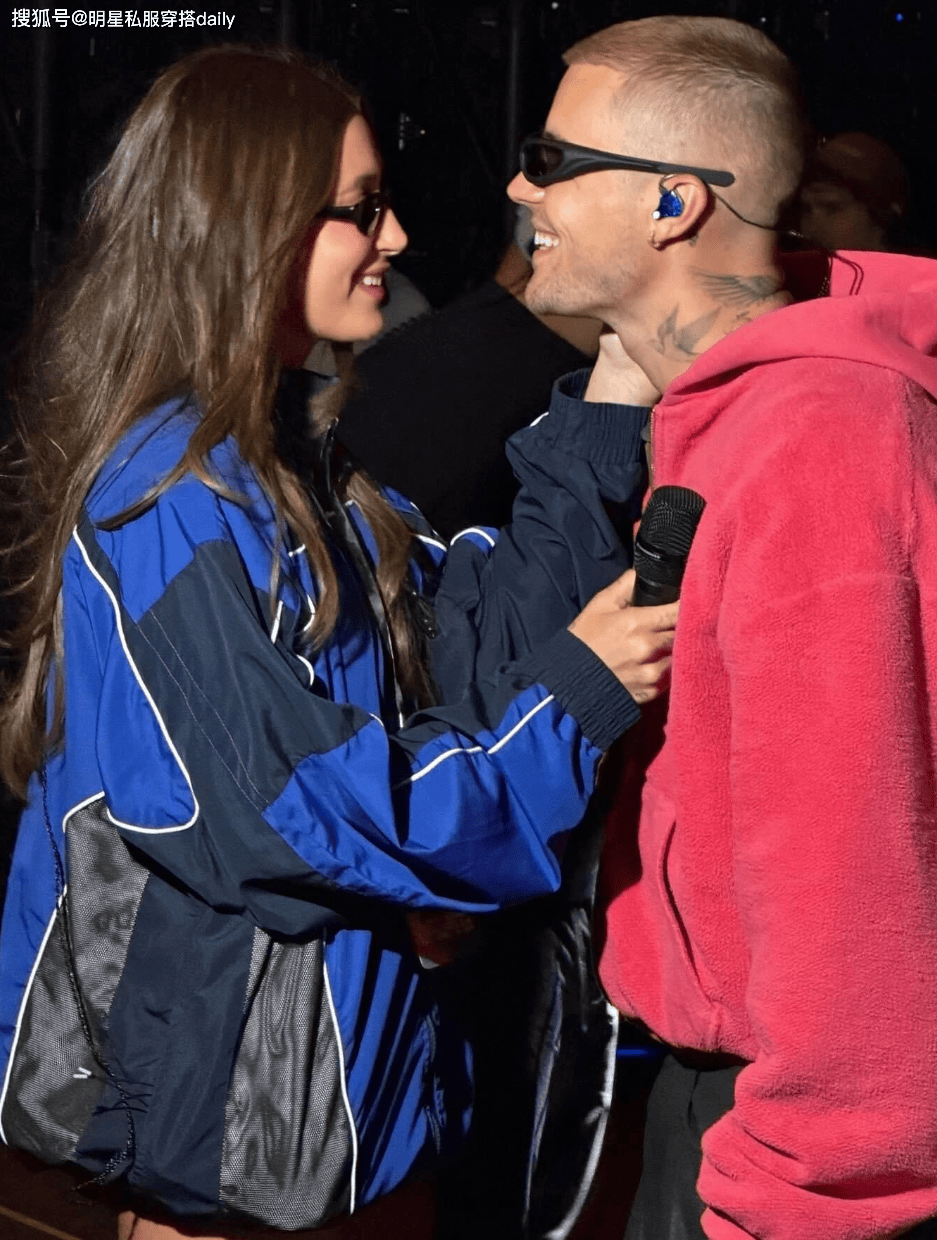 而比伯则身穿红色连帽卫衣搭配黑色工装裤,夫妻二人越来越有夫妻相!