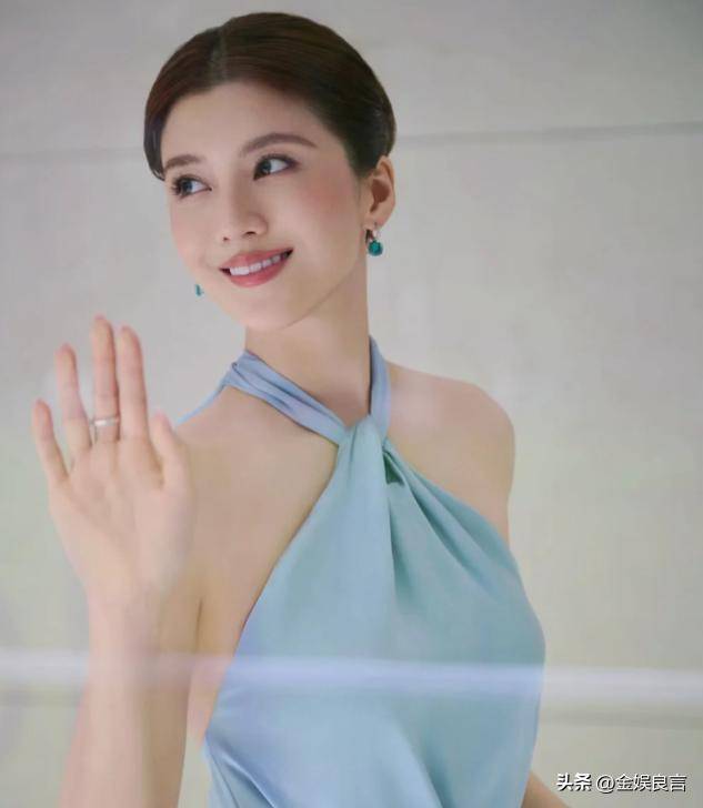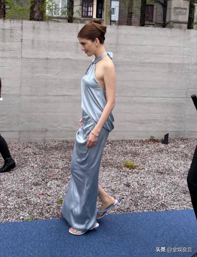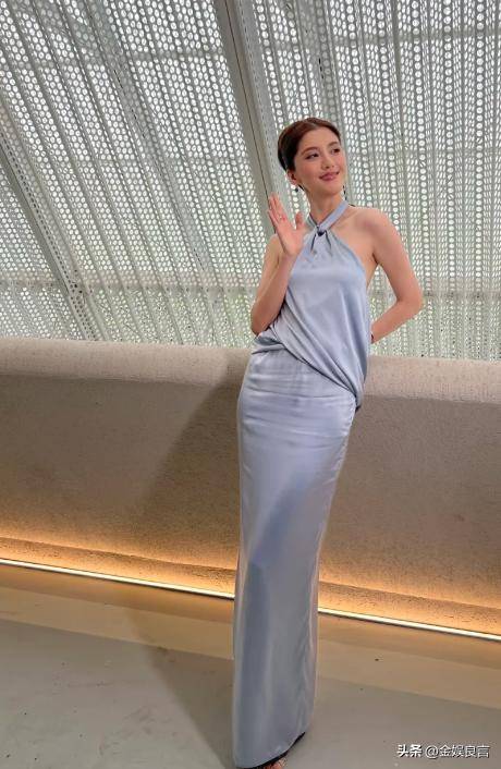 她身着一袭雾霾蓝挂脖长裙,绸缎面料自带细腻光泽,贴肤却不紧绷,完美勾勒出她纤细的腰肢和流畅的腰线,走动时轻轻摇曳,自带优雅气场。