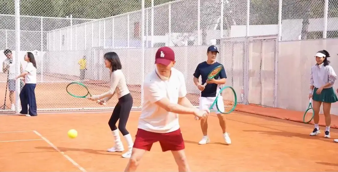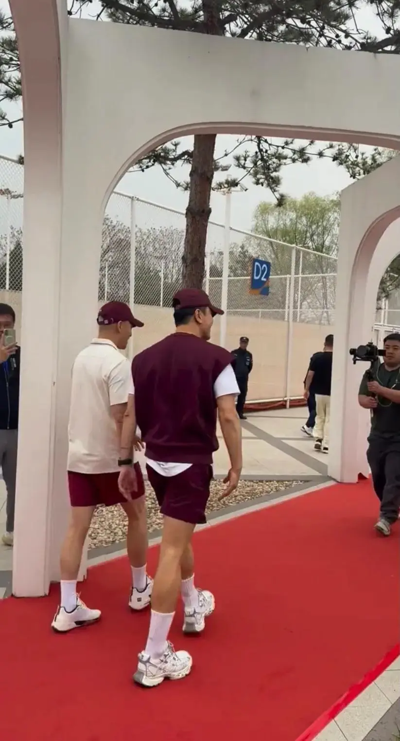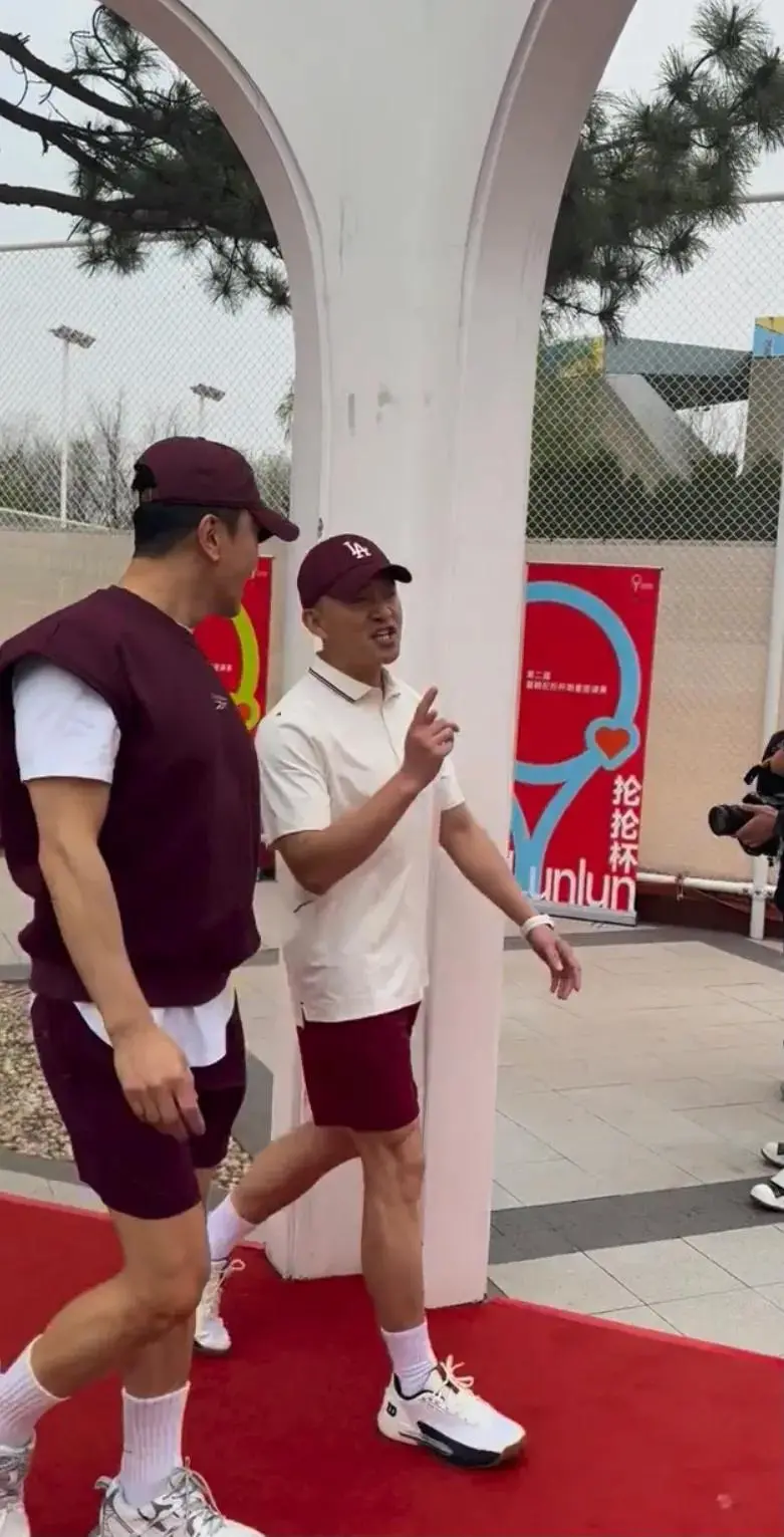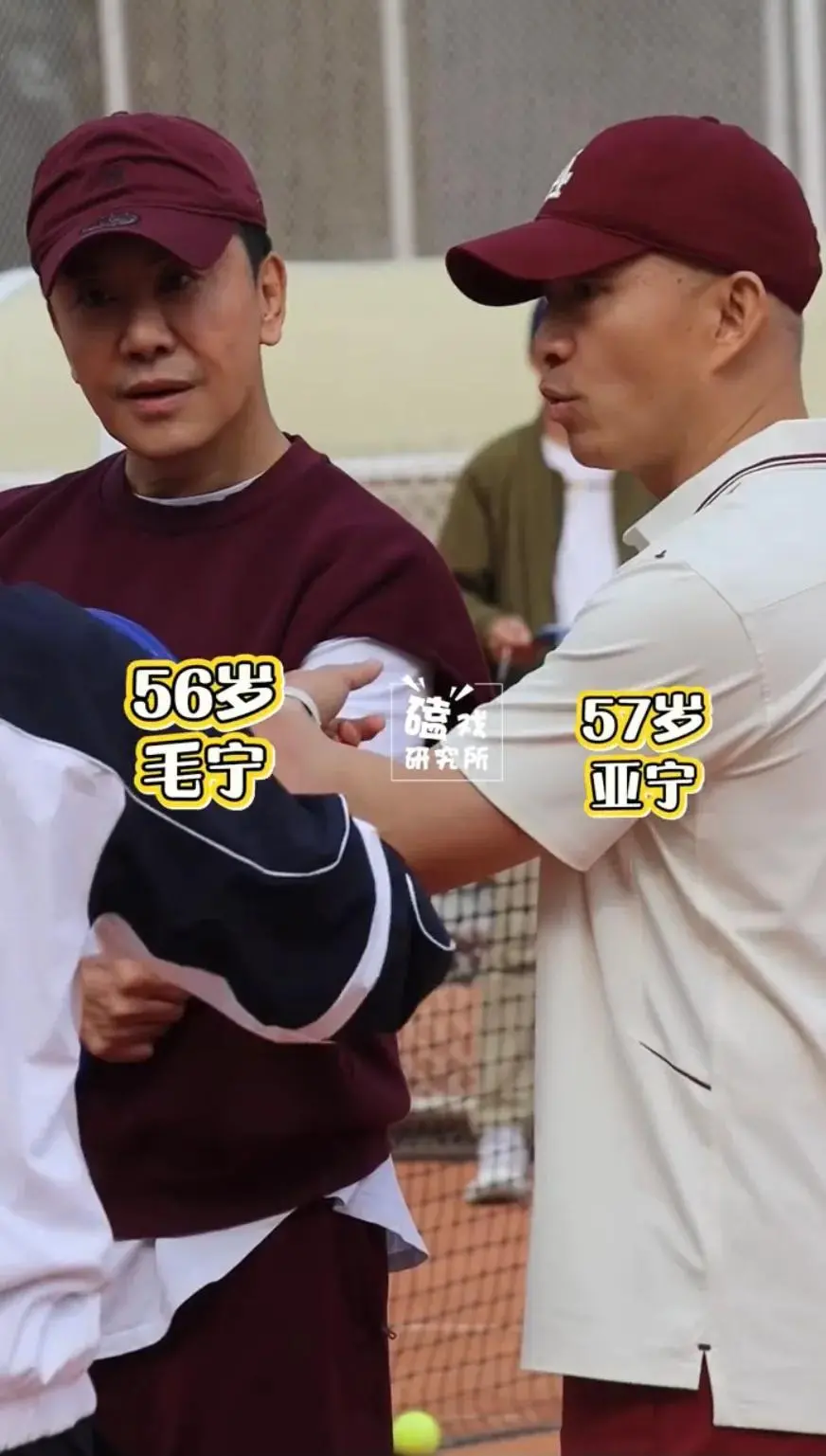 和瞿颖在赛场上对打的是毛宁和亚宁,他俩竟然一起俩参加这场活动,两人还都穿着绛红色的网球服,戴着同款的棒球帽。亚宁穿白色polo衫很俊朗,毛宁练出胸肌了,他的肩很宽厚,56岁的毛宁身材保持的很好。