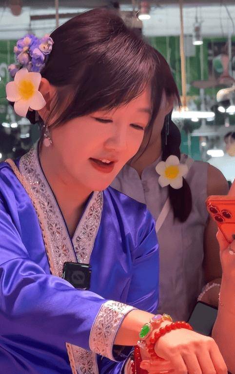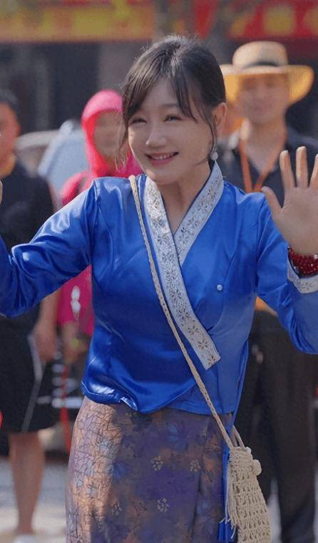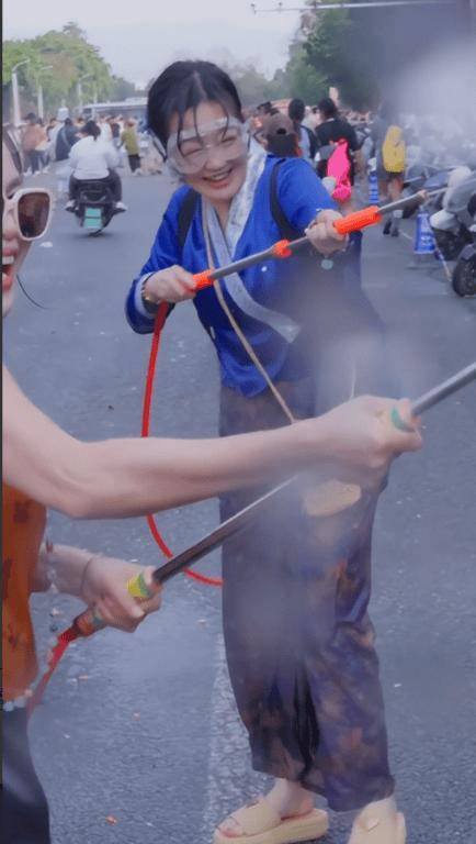 当天薛佳凝的打扮很有节日感,宝蓝色傣族缎面上衣配复古印花半身裙,头上别着一朵清新鸡蛋花,温婉又接地气,完全融入当地热闹氛围里。她戴着护目镜,手里攥着大水枪,和周围人互相泼水追逐,浑身湿透也毫不在意,笑得特别灿烂,还跟身边人说:泼你的人越多,收到的祝福就越多。看得出来,她是真的在享受节日,而不是走流程打卡。
