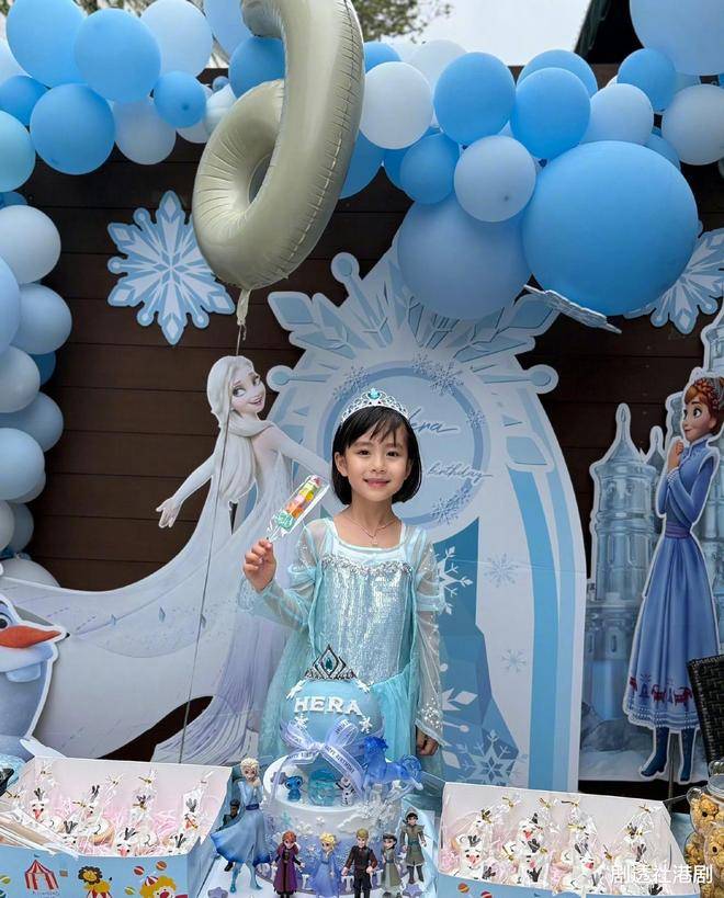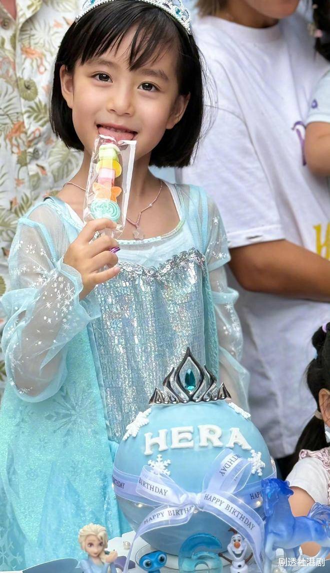派对的布置别具心思,虽然是在室外举行,但装饰的气氛十分温馨。场地中充满了蓝色的气球,符合生日派对冰雪奇缘的主题,而小珍珠穿着一袭可爱的连衣裙,仙气十足。六岁的她已经渐渐展现出越来越美丽的容貌,眼睛大而圆,嘴巴和下巴也酷似妈妈杨茜尧。母女俩简直像是一个模子刻出来的。