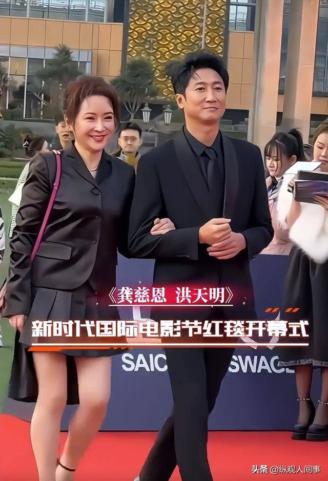 洪天明一身黑色西装,身姿挺拔,全程护着龚慈恩,一举一动都尽显体贴,看得出来私下关系十分要好。