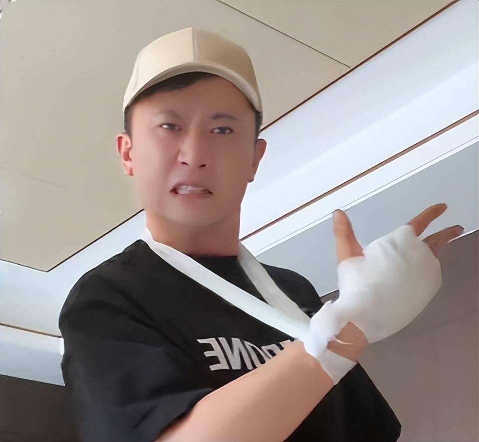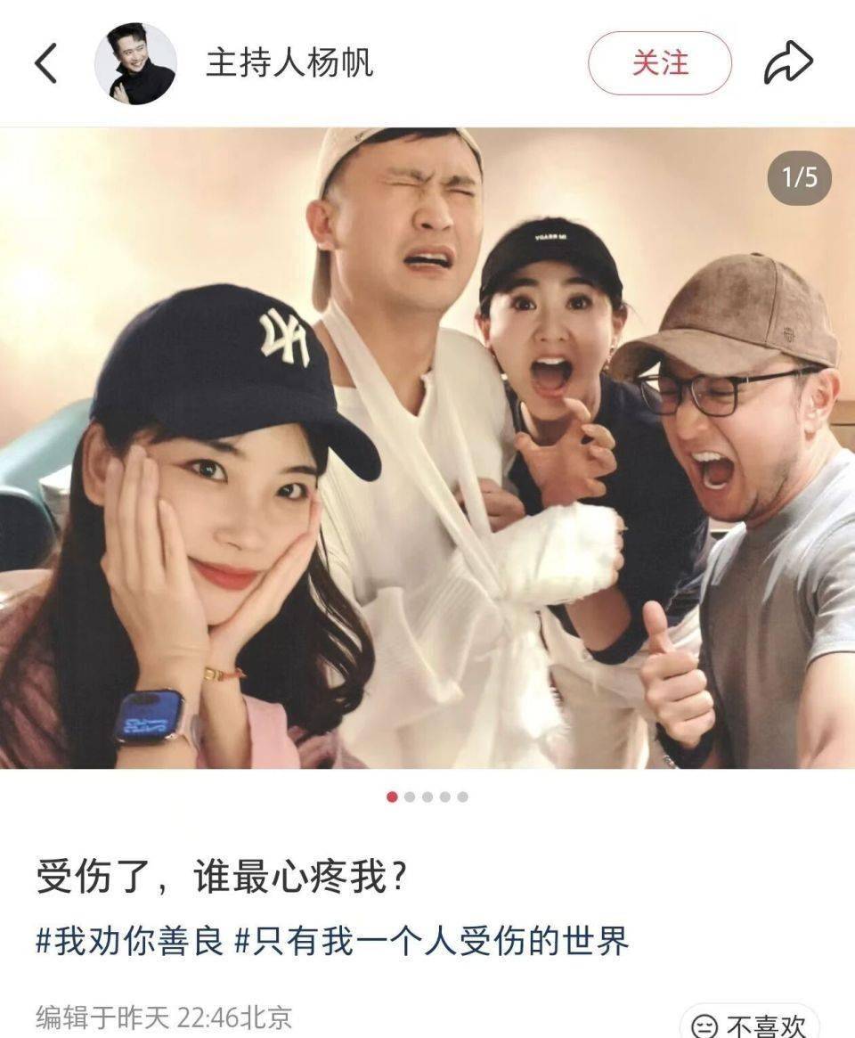 合照里,杨帆坐在中间,眉头拧成了疙瘩,嘴巴微微撇着,那股子委屈劲儿跟受了欺负的小朋友似的,受伤的胳膊规规矩矩地吊在胸前,左手还下意识地护着伤口,看着又心疼又好笑。