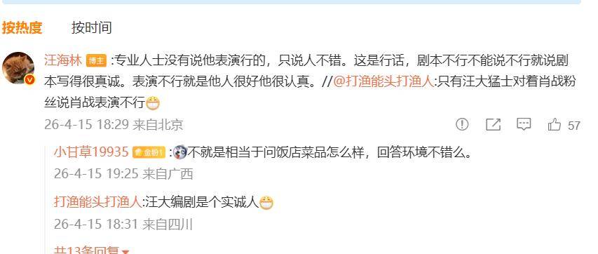 汪海林老师那可是出了名的不惯着,直接回怼:“专业人士没有说他表演行的,只说人不错。这是行话,剧本不行不能说不行就说剧本写得很真诚。表演不行就是他人很好他很认真。”