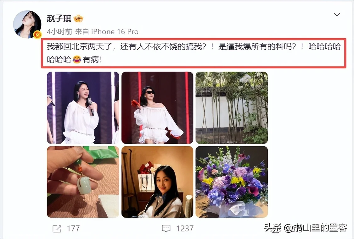 更让赵子琪受不了的是,她已经被淘汰离开节目,人都回北京了,网络上的黑稿还没停,有人不断带节奏,翻出陈年旧事抹黑她,想把她钉在负面标签上。