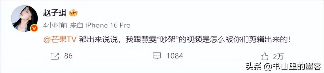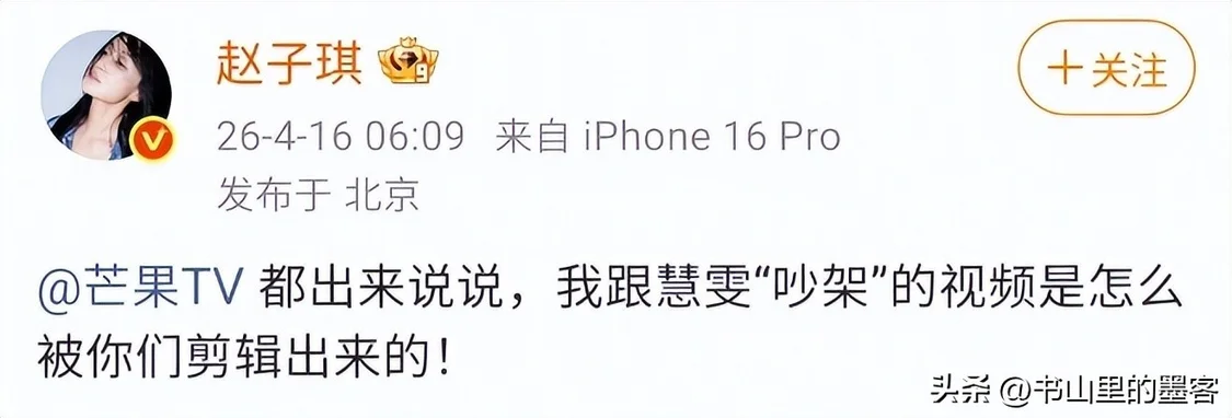 该说不说,芒果台这次是真的踢到铁板了。4月16日凌晨,刚从《乘风2026》淘汰回京两天的赵子琪,突然在社交平台连发两条动态,直接把芒果台推上风口浪尖。她先是@芒果TV,质问对方自