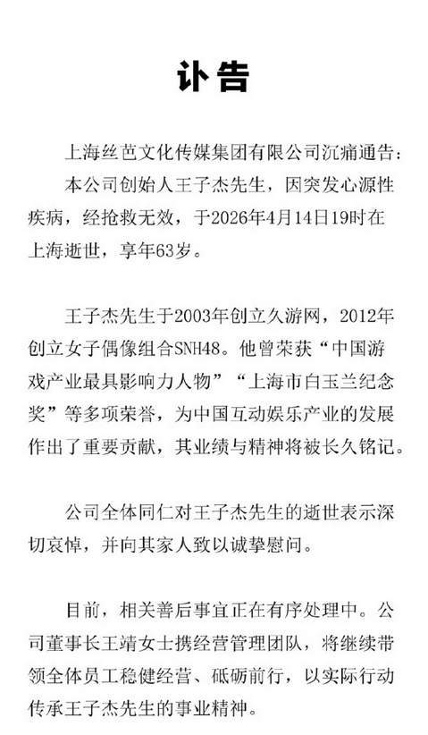 63岁。这个数字定格在了4月16日。王子杰走了。不是退休,不是隐退,是彻底的告别。那个把SNH48从0做到1的男人,那个被粉丝又爱又恨喊了十几年的"王子",再也没机会看到鞠婧祎的官司结局了。