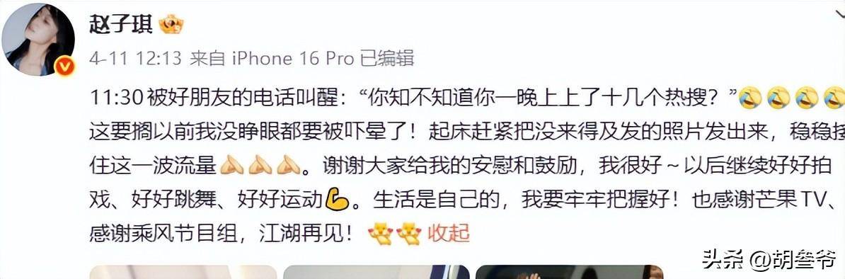 4月11日凌晨,赵子琪就发微某博表态:“我一点都不难过!不会再来!”