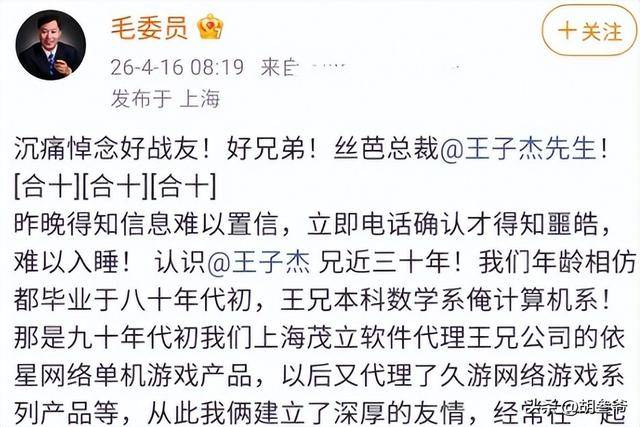 到了4月16日早上9点多,王子杰的多年好友,深圳米享科技董事长毛委员公开发文悼念,直接打破了谣言的猜测。
