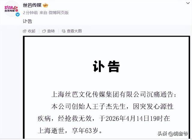 官方讣告内容非常明确:王子杰因突发心源性疾病,经抢救无效,于2026年4月14日19时在上海逝世,享年63岁,与此前好友透露的信息几乎完全吻合。