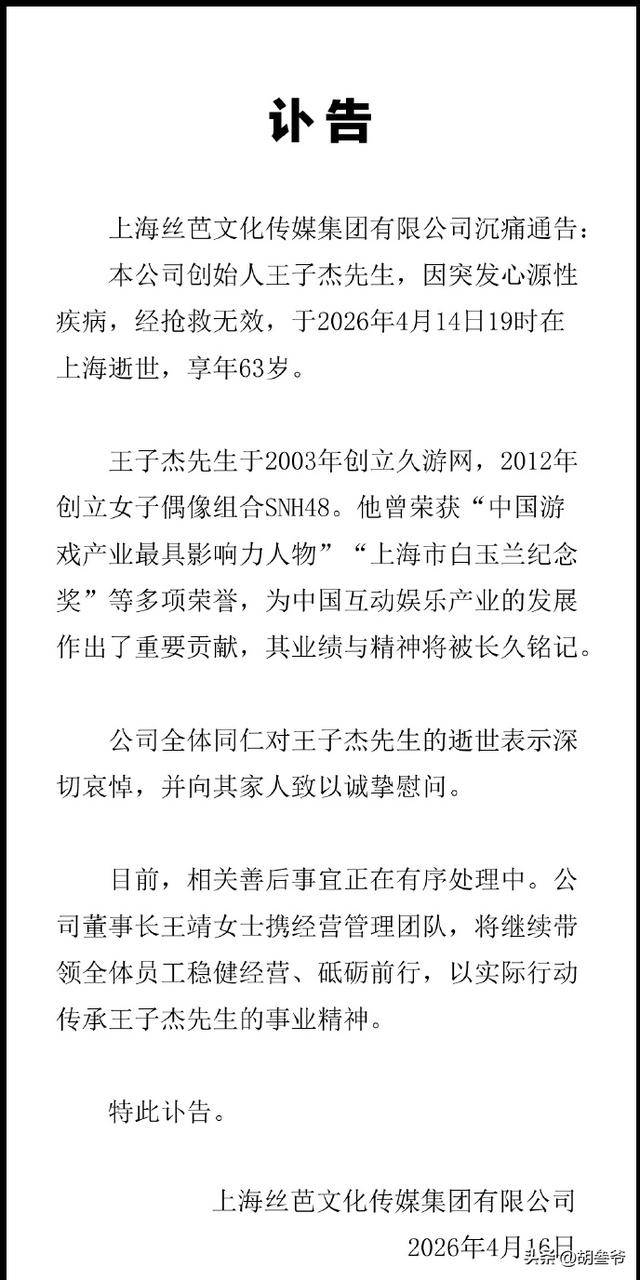 讣告中还回顾了王子杰创立久游网、打造SNH48的行业贡献,提及他曾获中国游戏产业最具影响力人物、上海市白玉兰纪念奖等荣誉。