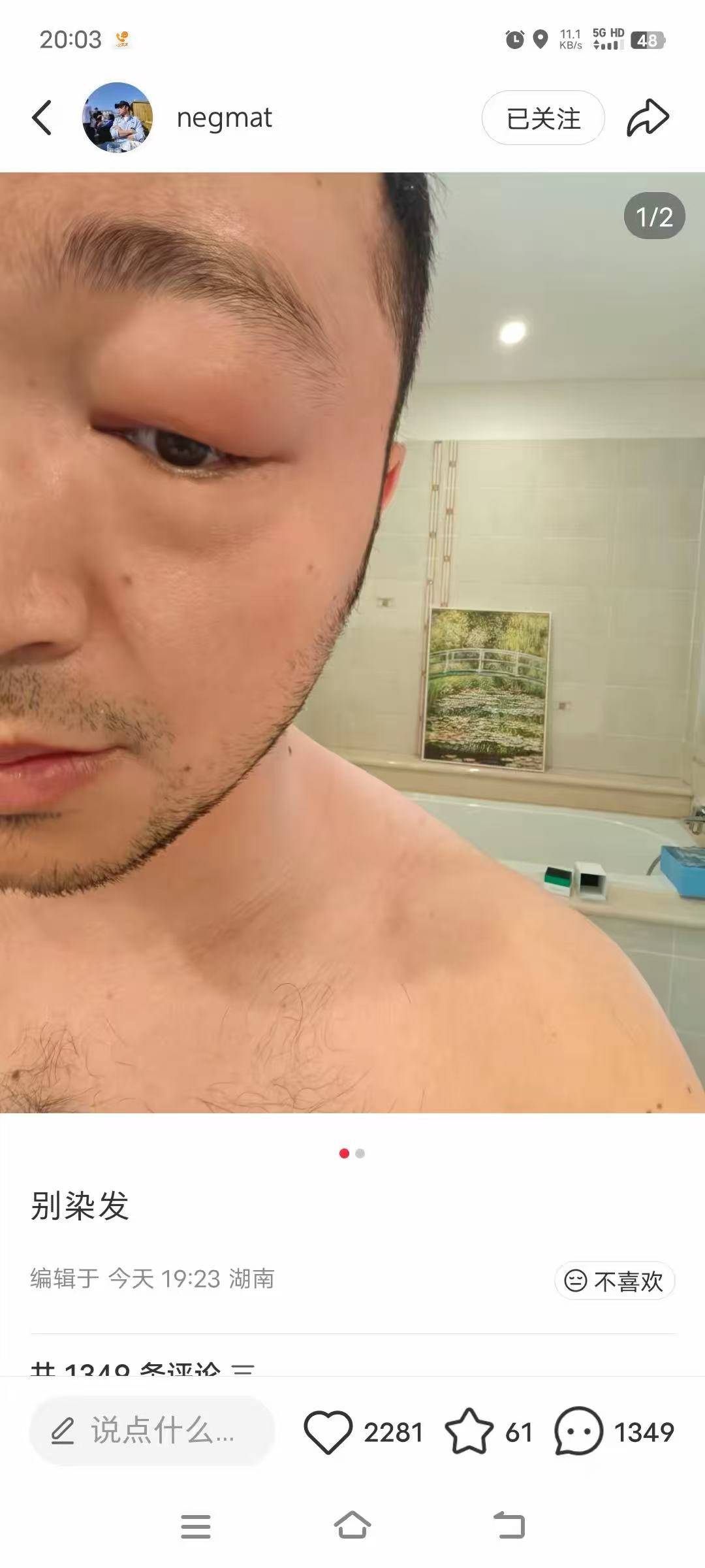 后来他在评论区解释,真相一点不狗血,却特别真实——在家自己染发,染发剂不小心弄进眼睛里,过敏了。