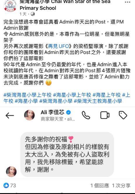 然而李佳芯本尊亲自留言,指照片经AI修复后与本人外貌出入太大,为保护个人资料已移除标签。