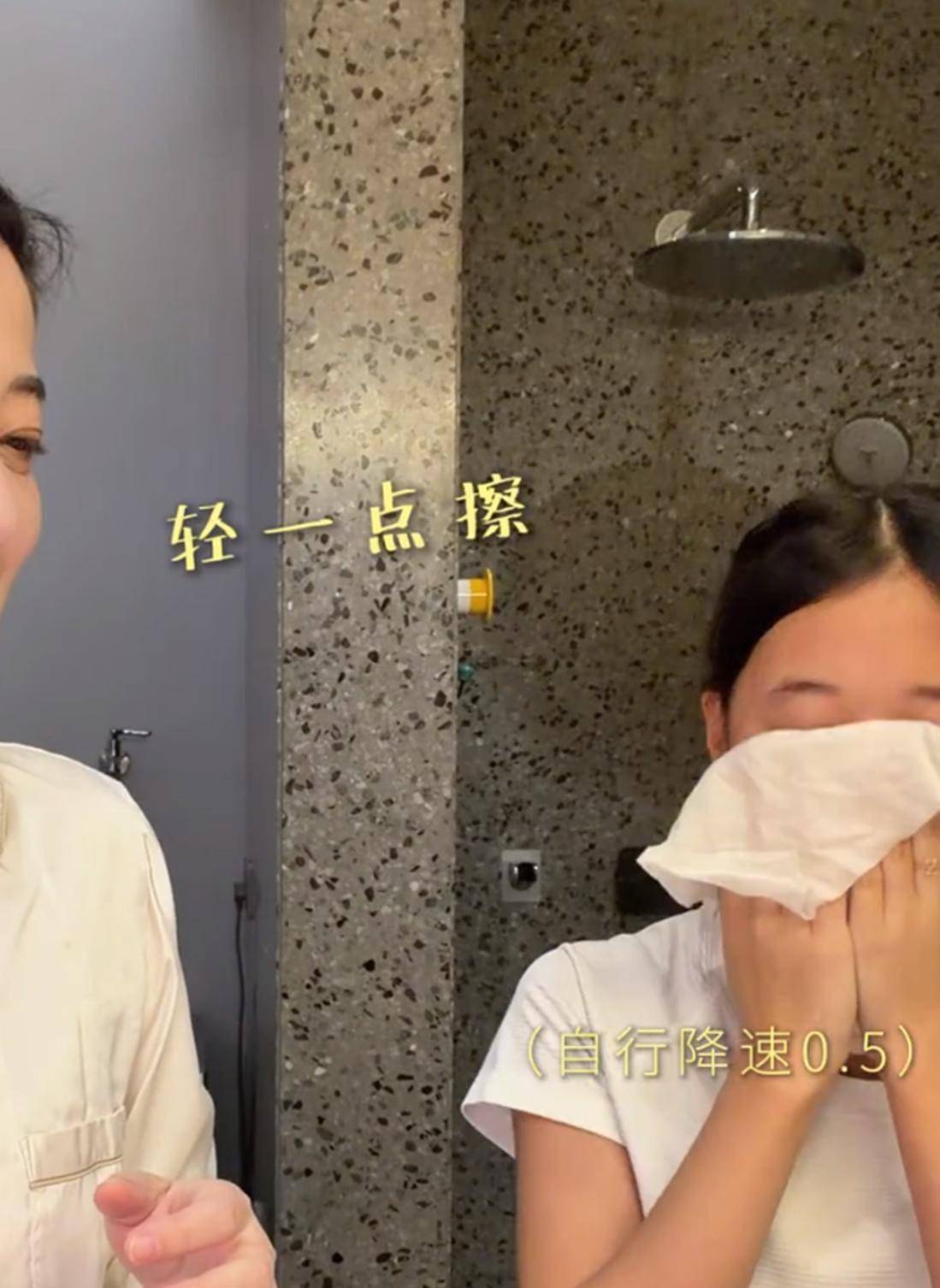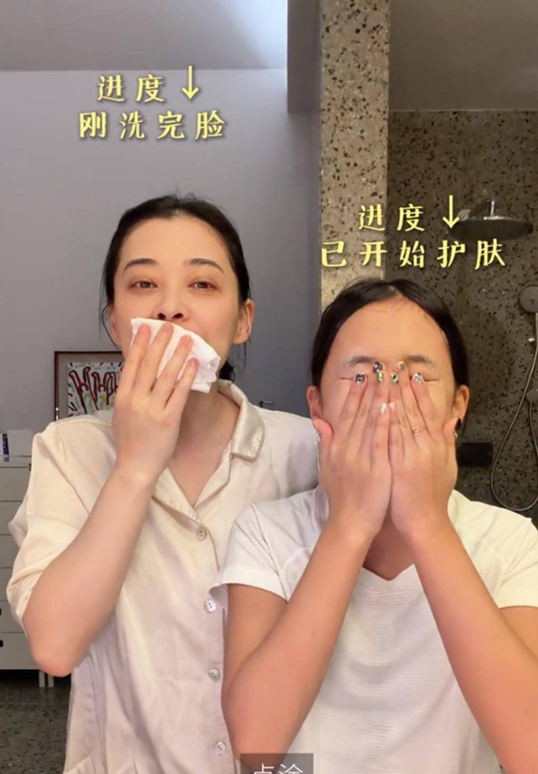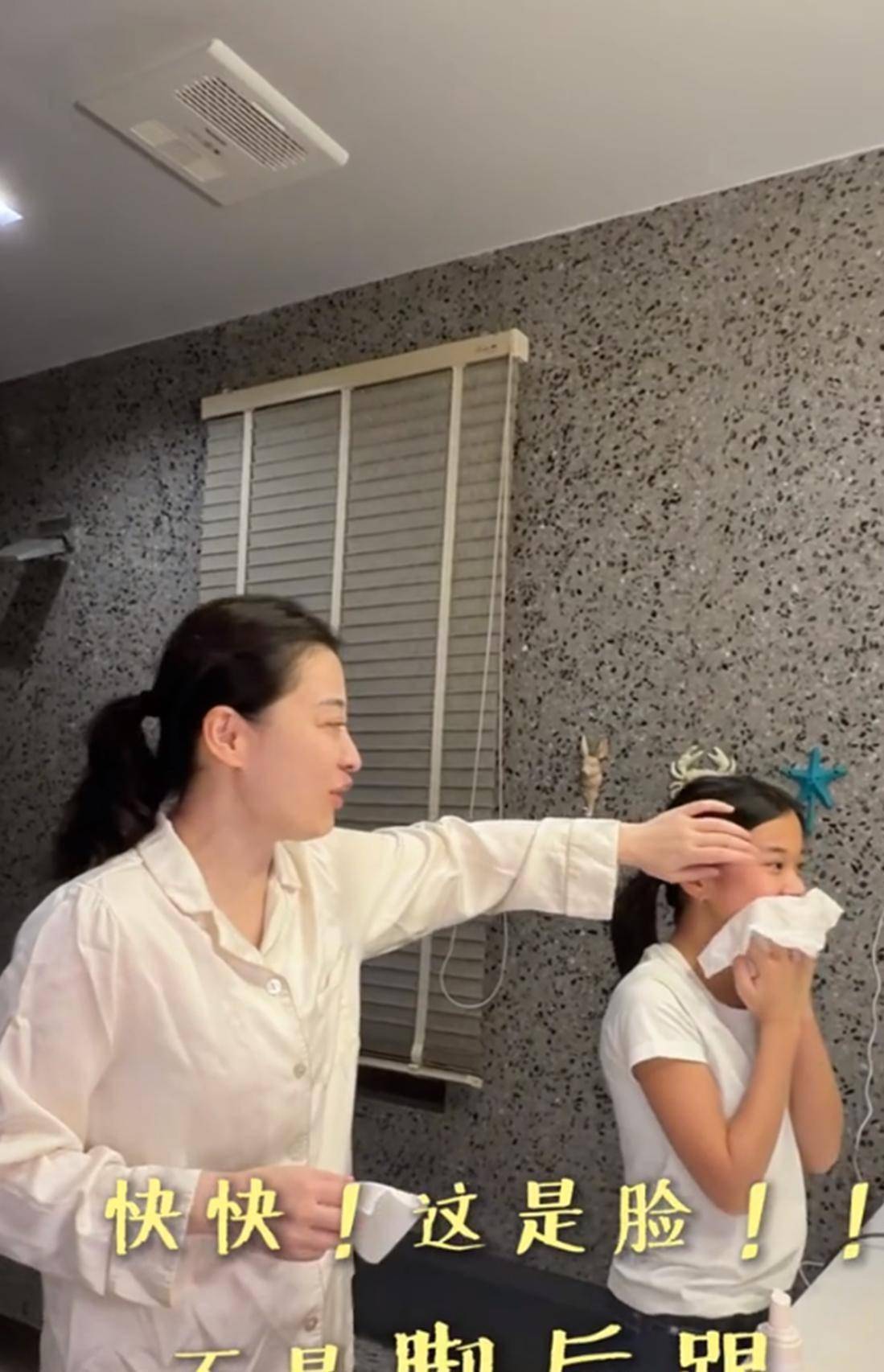 4月15日晚上,梅婷刚准备洗脸,就被旁边12岁女儿快快的动作逗笑了。 小姑娘双手在脸上大力揉搓,看着又急又猛。 梅婷站在一旁忍不住笑,一边笑一边吐槽:“快快,这是脸不是脚后跟。 ”