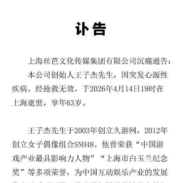 2026年4月16日上午11点,丝芭传媒官网变黑白。讣告发布:创始人王子杰因突发心源性疾病,经抢救无效,于2026年4月14日19时在上海逝世,享年63岁。 接近公司核心管理层的知情人士透露