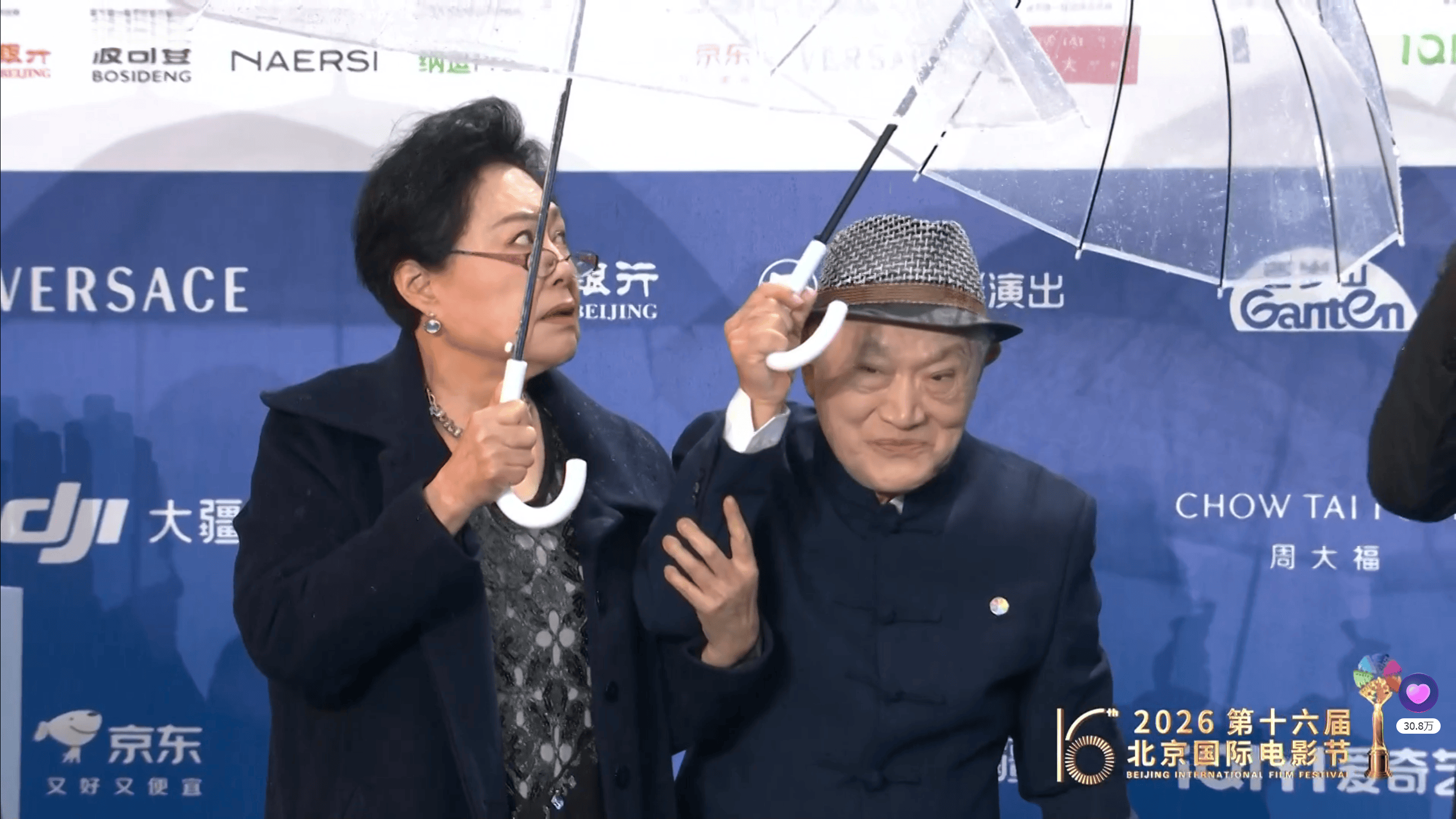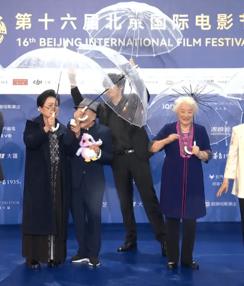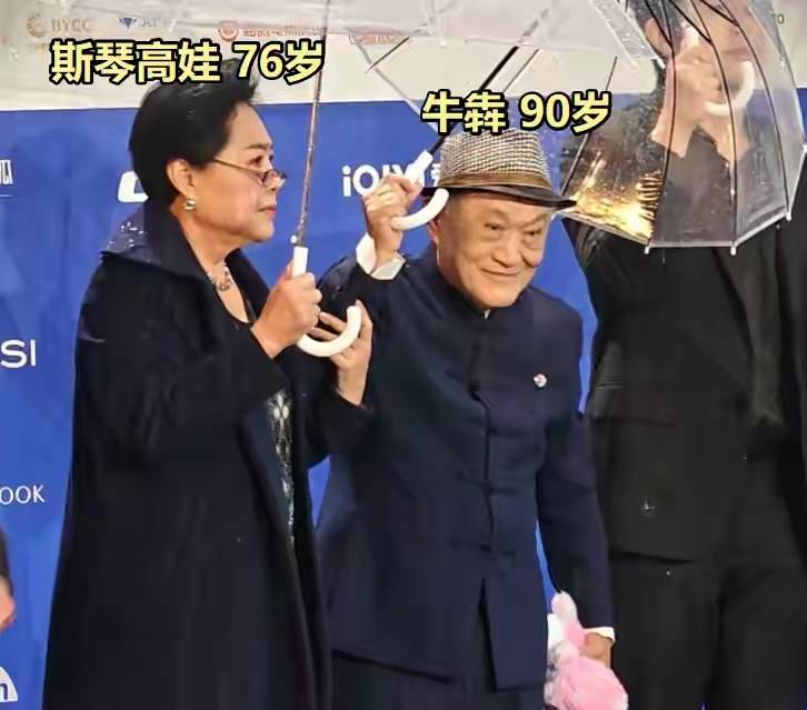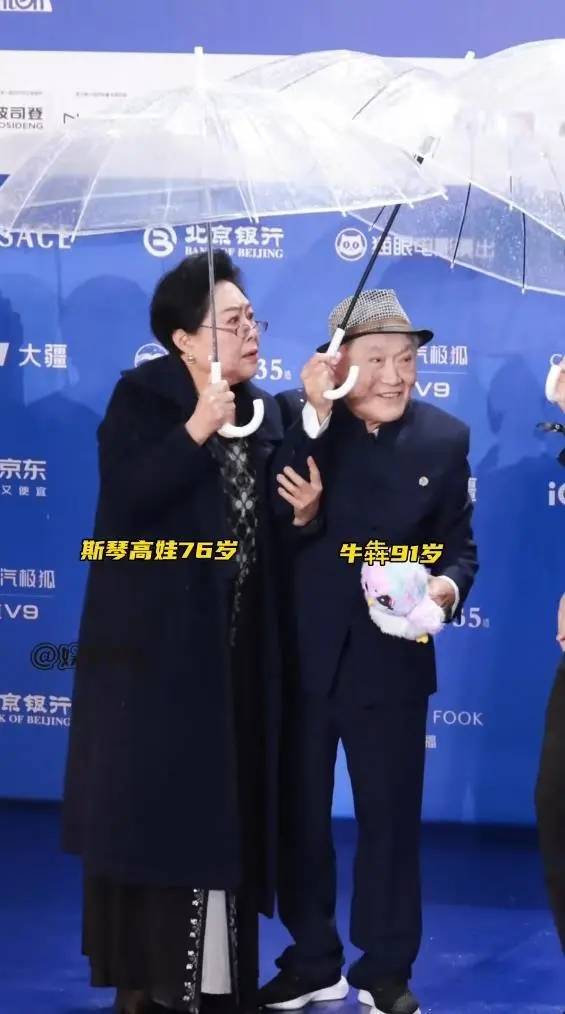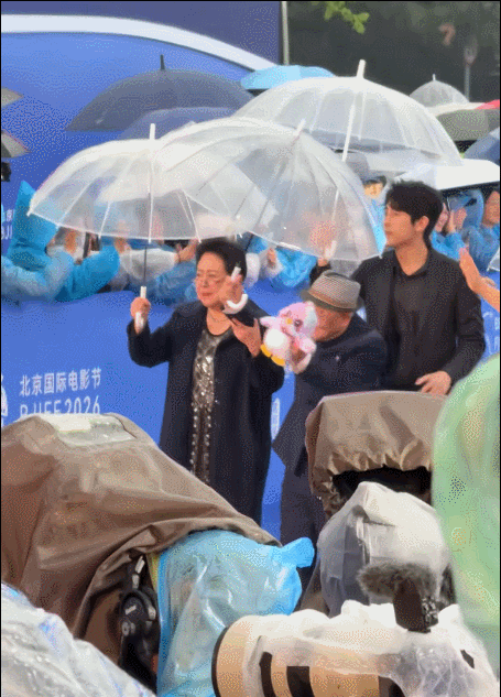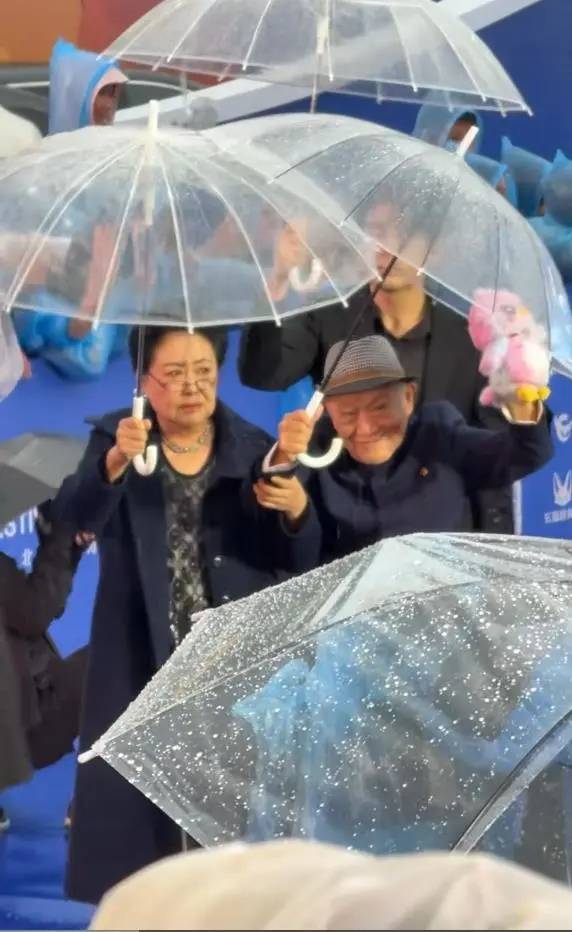 开幕式还没开始,雨先把气氛“开”起来了。有人在红毯边喊了一句:“牛老师慢点儿!”镜头一抬,76岁的斯琴高娃扶着90岁的牛犇,伞沿压得很低,脚下每一步都像在