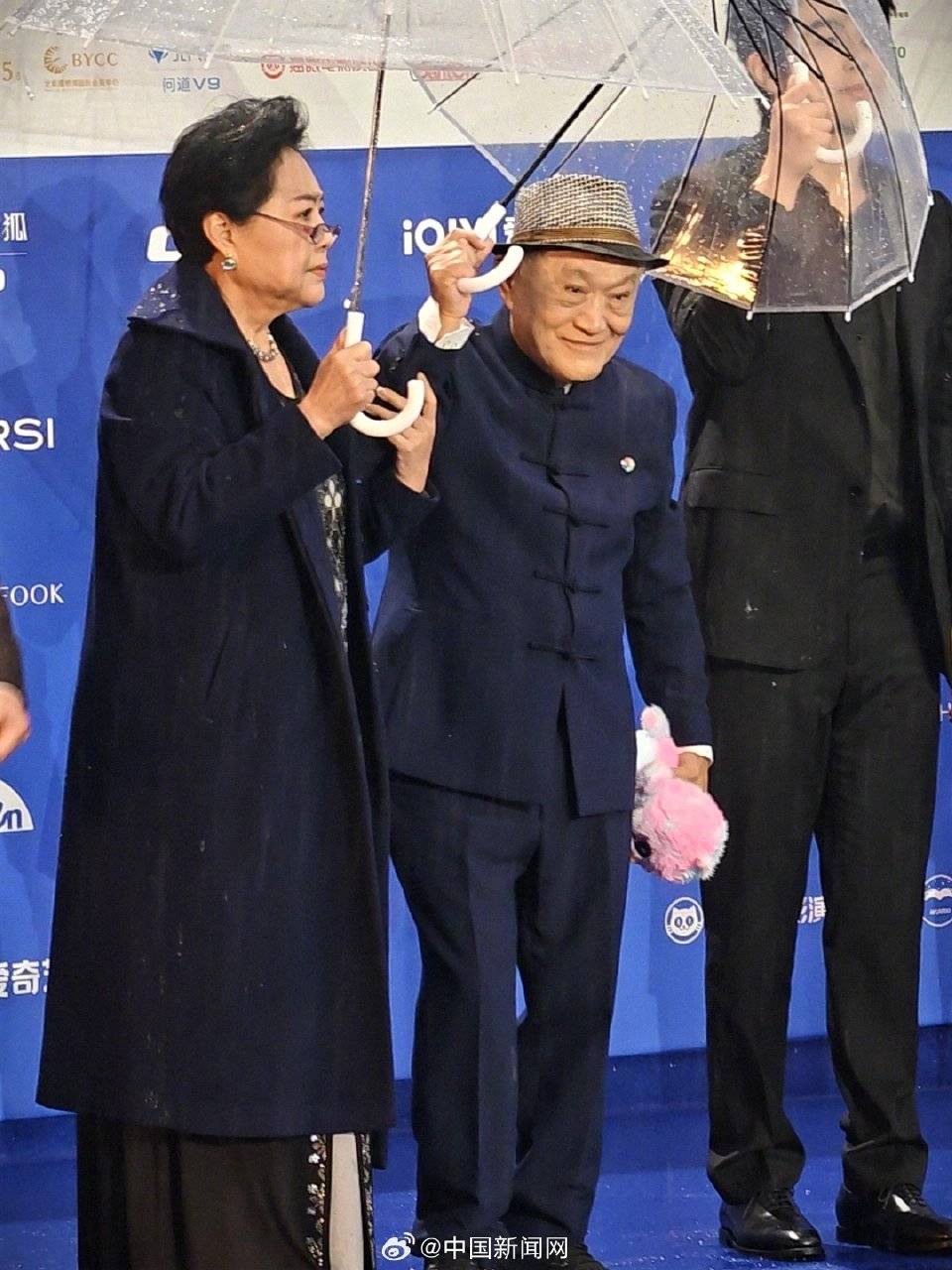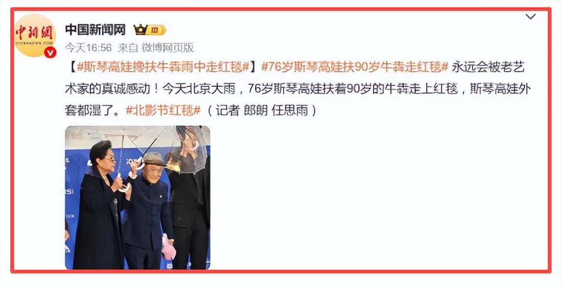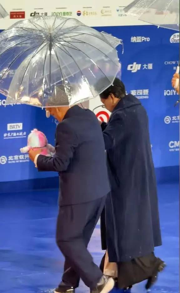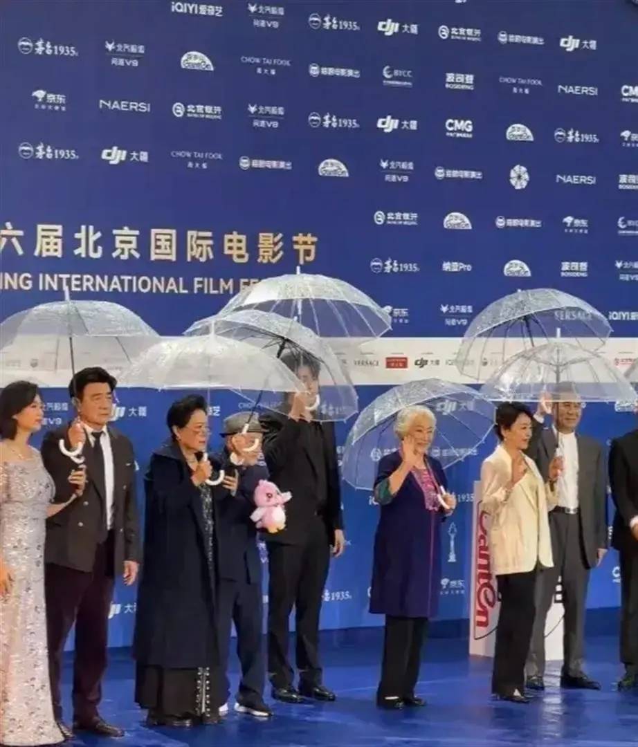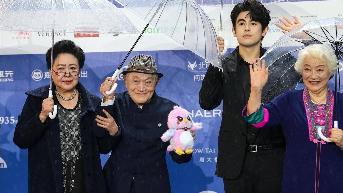 开幕式还没开始,雨先把气氛“开”起来了。有人在红毯边喊了一句:“牛老师慢点儿!”镜头一抬,76岁的斯琴高娃扶着90岁的牛犇,伞沿压得很低,脚下每一步都像在