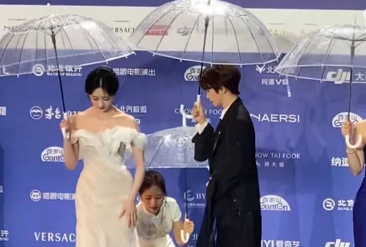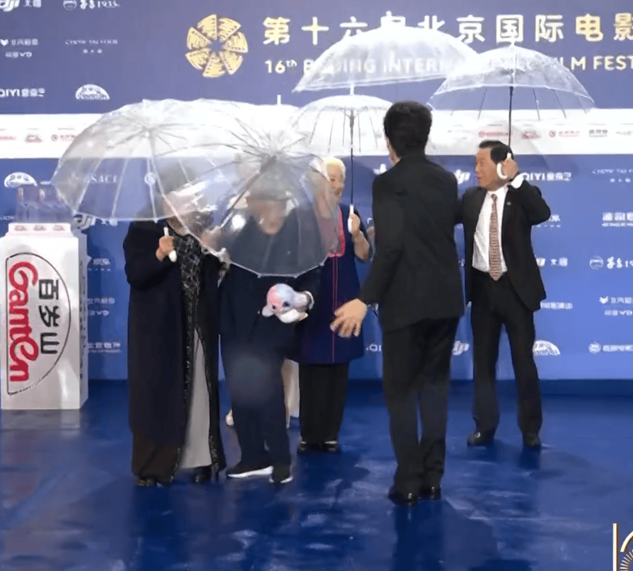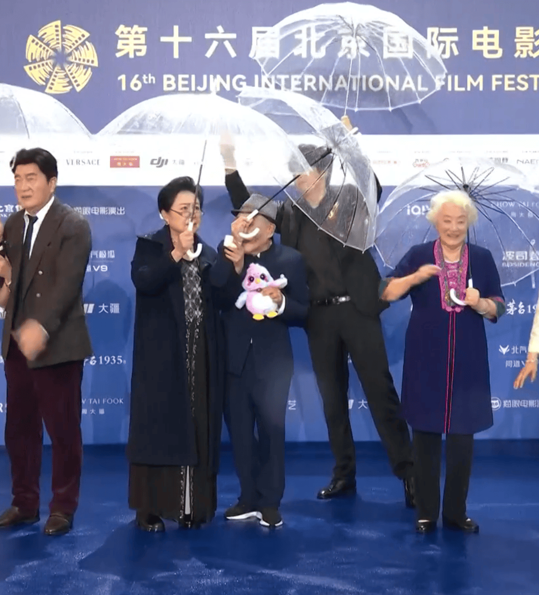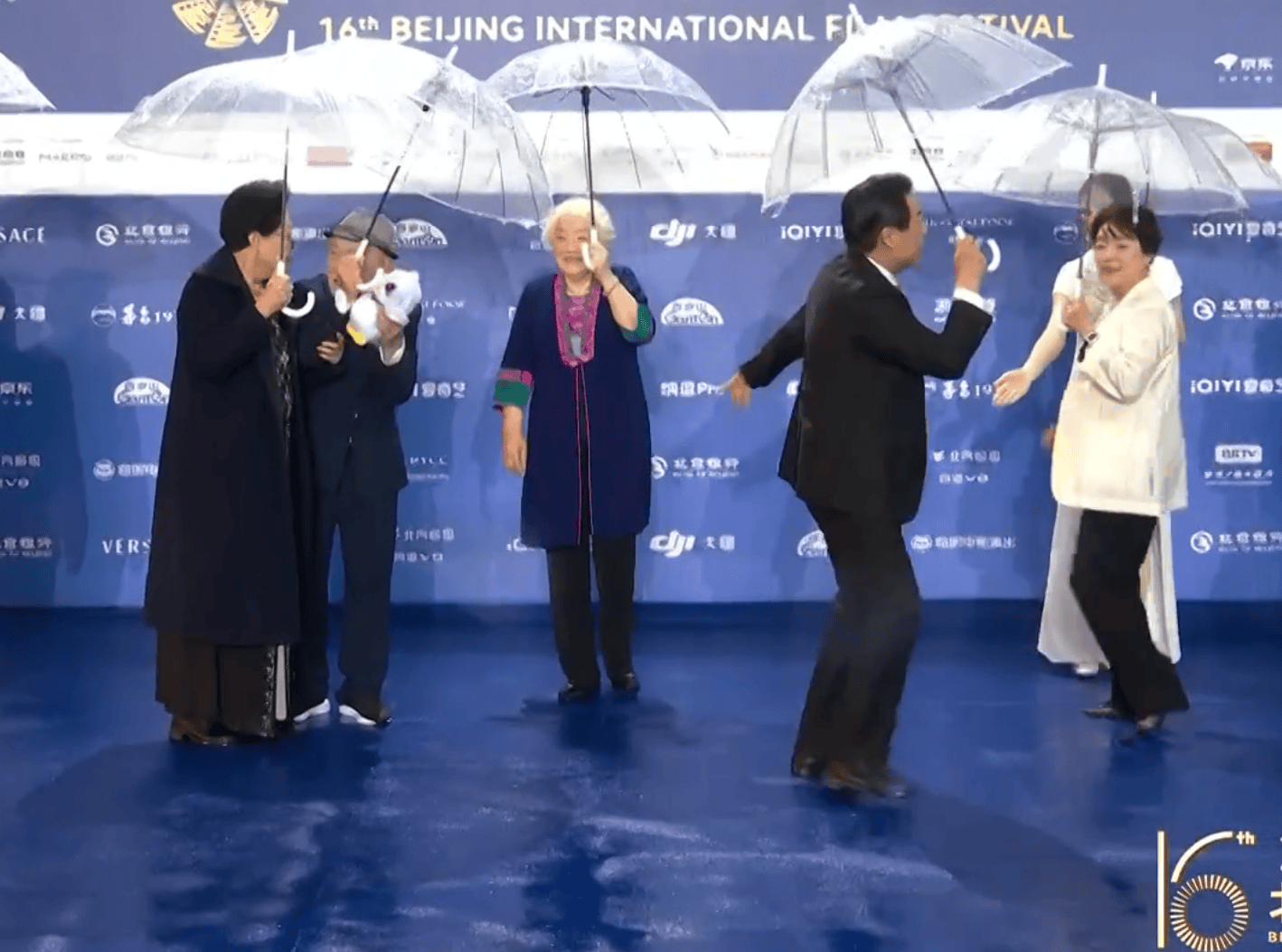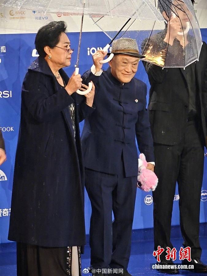 开幕式还没开始,雨先把气氛“开”起来了。有人在红毯边喊了一句:“牛老师慢点儿!”镜头一抬,76岁的斯琴高娃扶着90岁的牛犇,伞沿压得很低,脚下每一步都像在