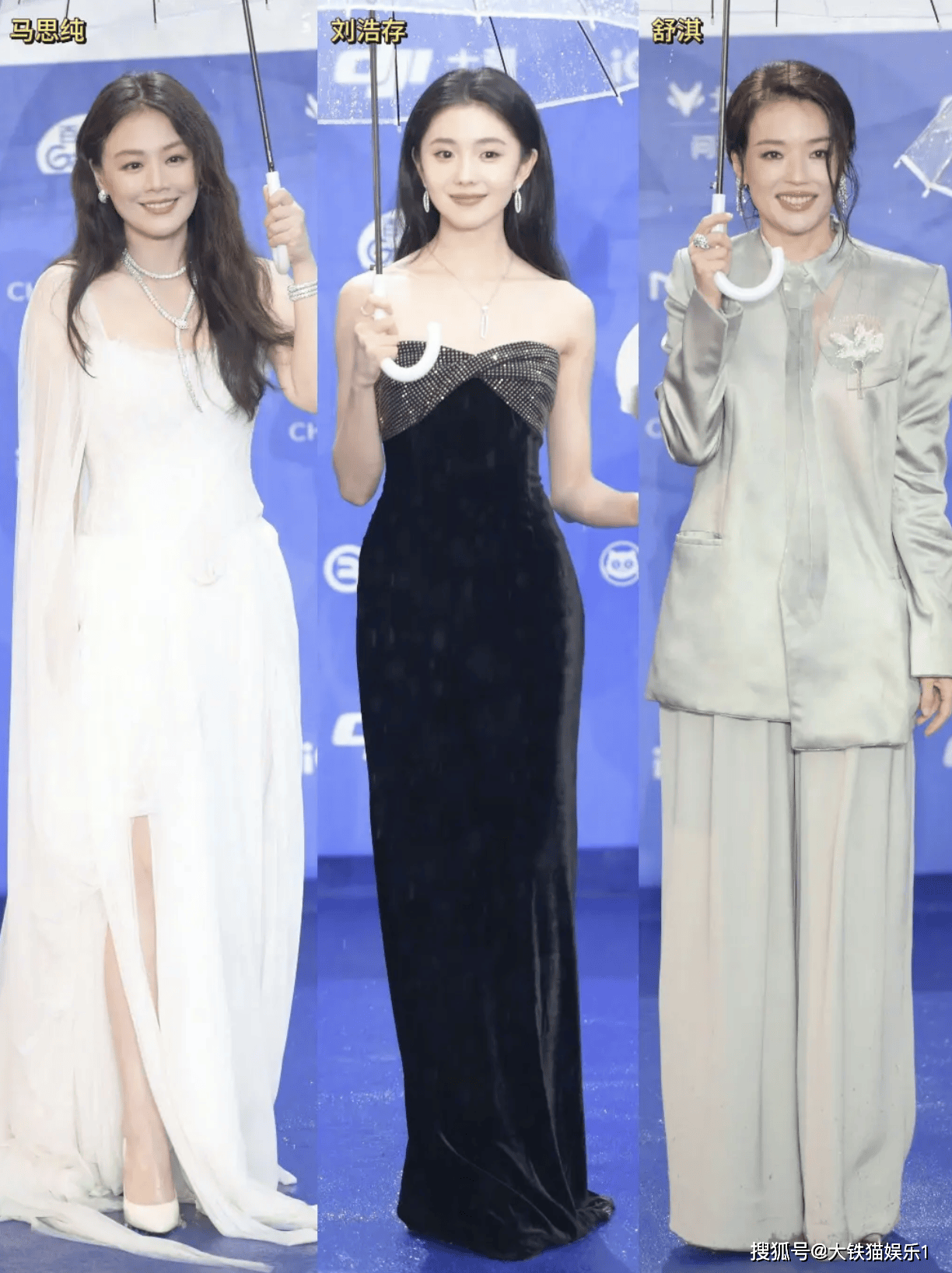 于是乎,我们看到了平时红毯看不到的一幕,穿着高定礼服,化着精致妆容的女明星们个个撑着一把伞,提了裙子没顾上雨伞,多少有几分狼狈。