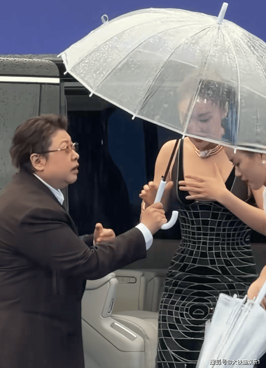 两位女士是搭乘同一辆车到现场的,当时雨越下越大,坐在右侧的韩红率先下车,冰冷的大雨瞬间扑面而来,密集的雨珠打得人睁不开眼。