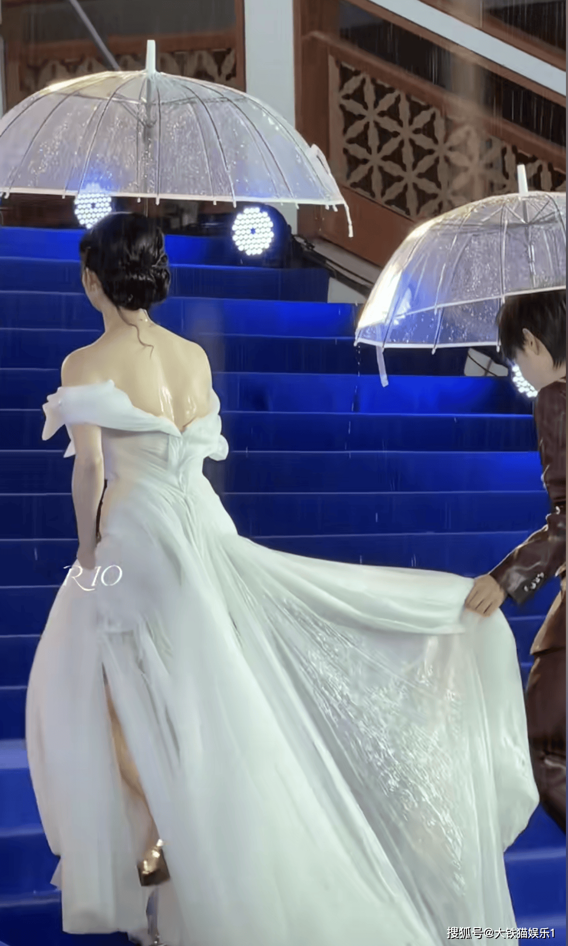 周洁琼的礼服更蓬更不方便,虽然有同行的男嘉宾帮她拎裙摆,但伞太小,裙子太大,根本遮不住,能清晰地看到她的裙子全湿了,光秃秃的后背也落满了雨水。