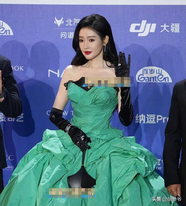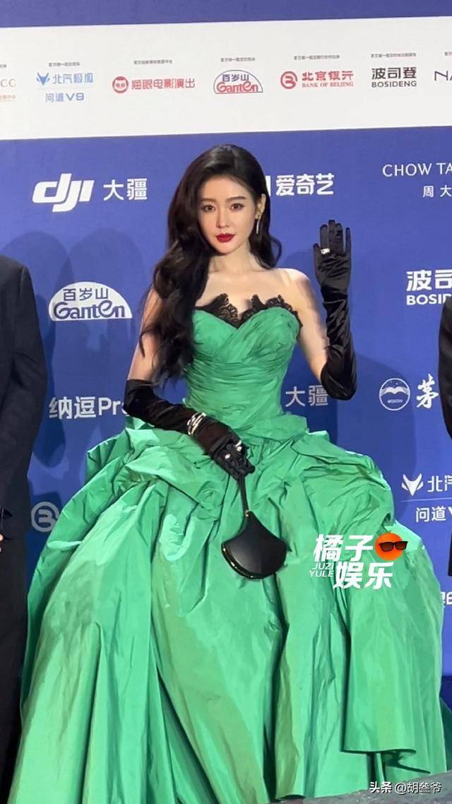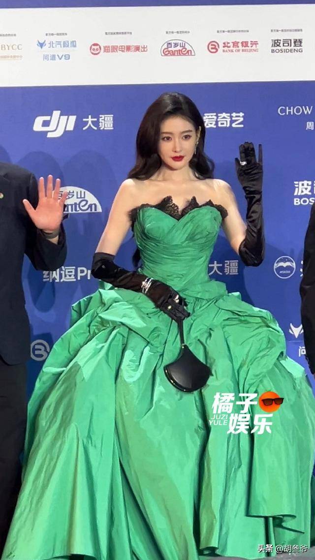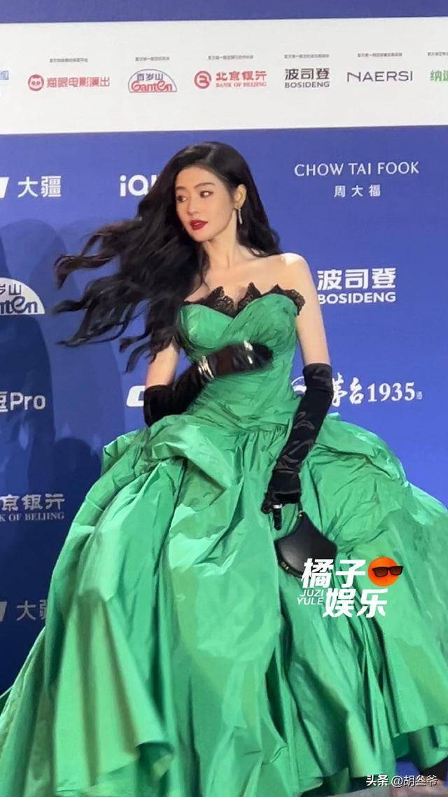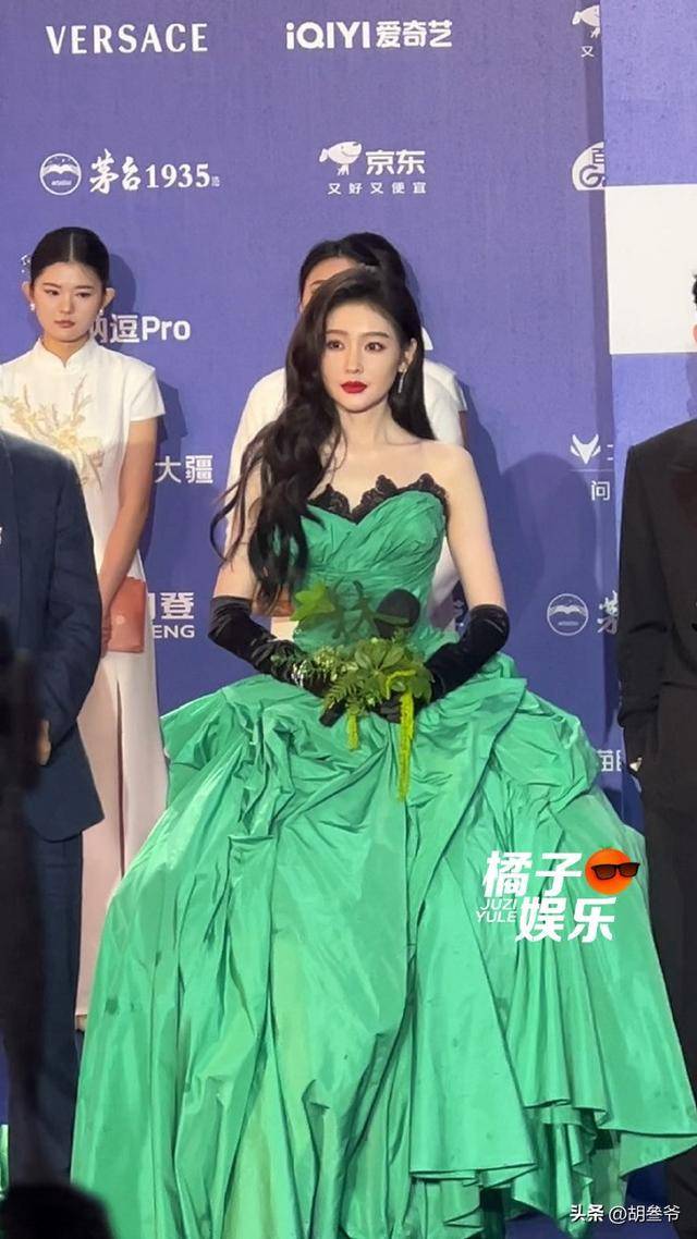 她穿的是一条高饱和度的绿色高定长裙,大裙摆设计飘逸又有分量。