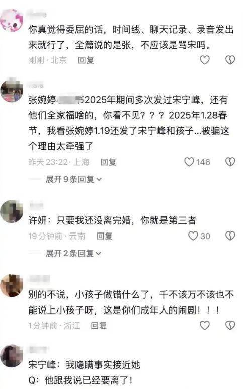 这场持续了半个月的闹剧,网友们从同情张婉婷,痛骂宋宁峰,到质疑张婉婷,质疑她窒息捆绑,再到吐槽Q女士,觉得她知三当三、又当又立,甚至不知廉耻挑衅原配。