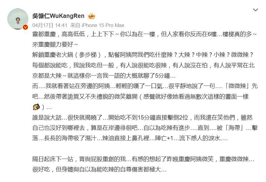 4月17日,演员吴慷仁发文自曝的一段在重庆被火锅“辣哭”的经历,生动上演了一出“自信入场,狼狈退场”的喜剧,不仅让网友笑出眼泪,更让重庆火锅的“辣