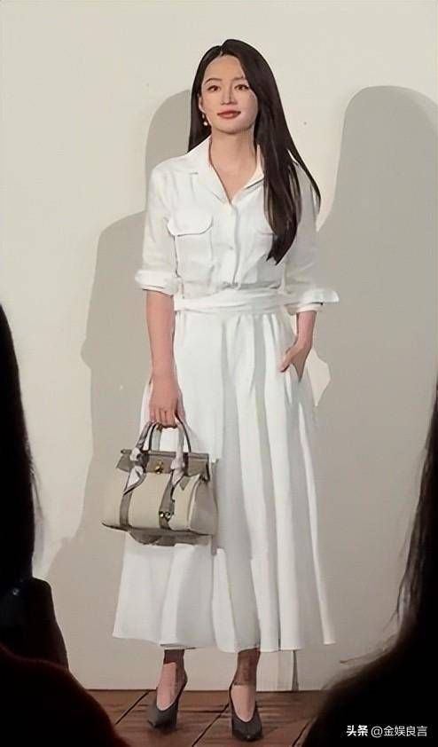 不管是和旁人寒暄还是缓步走动,腰背始终挺拔,天鹅颈线条流畅利落,原生美貌完全不用滤镜修饰,活脱脱从江南烟雨中走出来的大家闺秀。